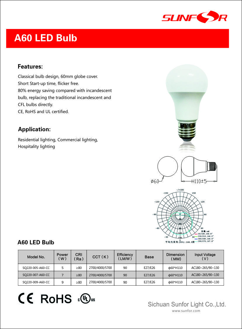 80% energy saving compared with incandescent bulb, replacing the traditional incandescent and CFL bulbs directly.