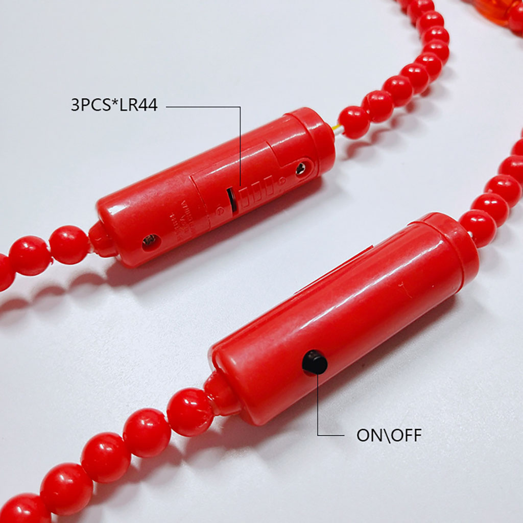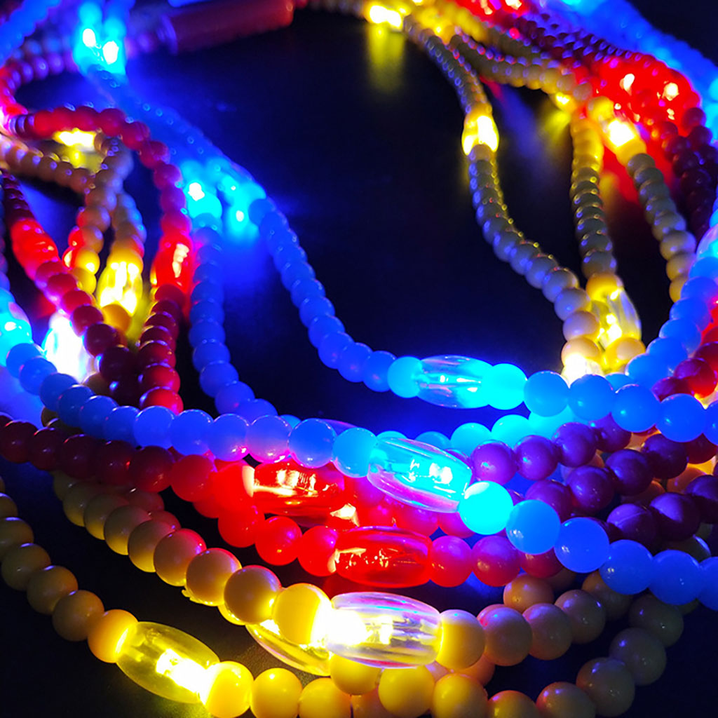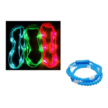 - 100 Plastic beads necklaces with 6 LED lights that illuminate with a brilliant glow