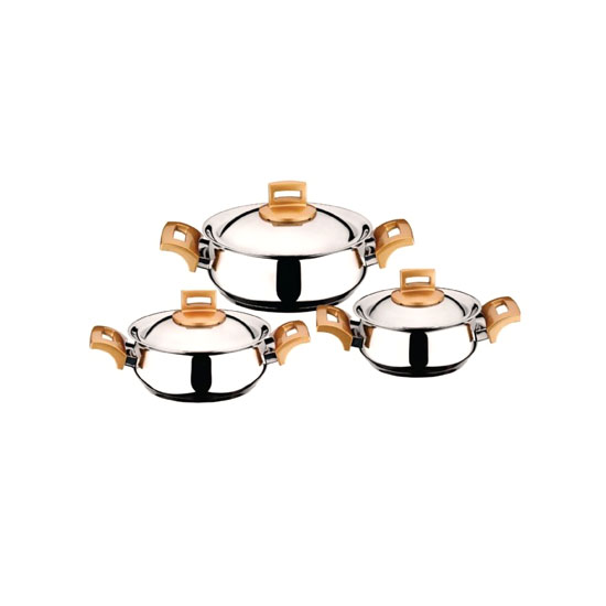 This is a 6-piece cookware set that includes three stew pots and three covers. The non-stick interior allows easy cleaning. This cookware set is an ideal addition to complete any kitchen.