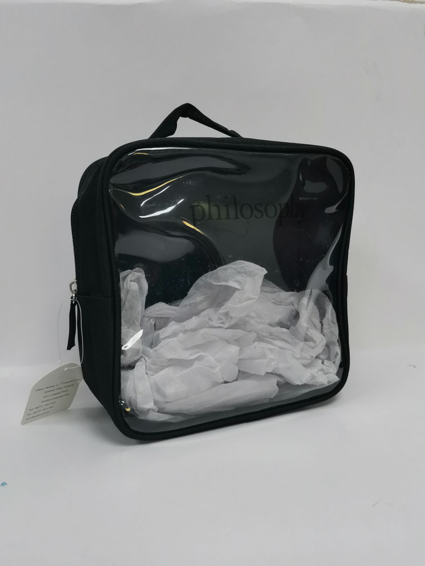 Cosmetic bag Body material:transparent EVA & 600D pu /lining:190T /Closing:5# nylon zipper + 600D pu puller /1*1C printing logo