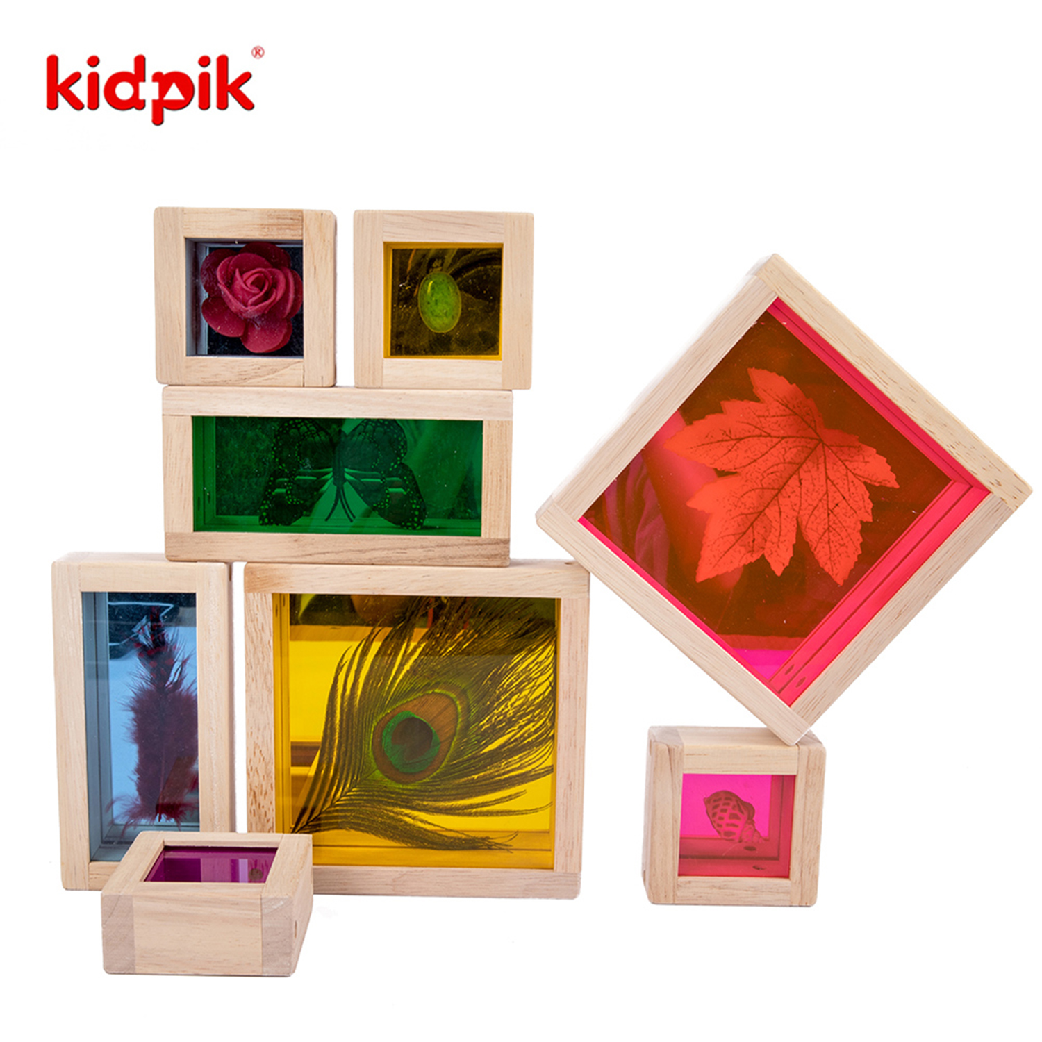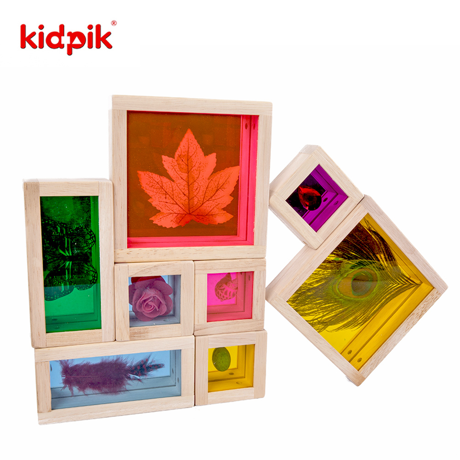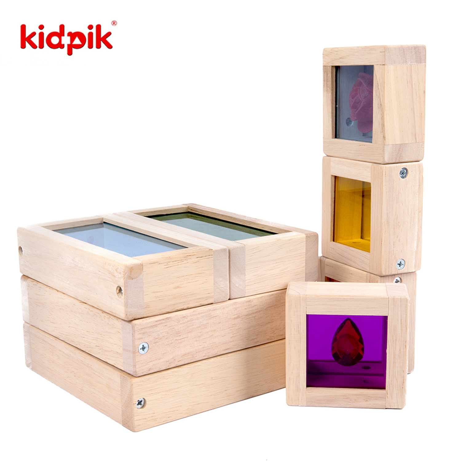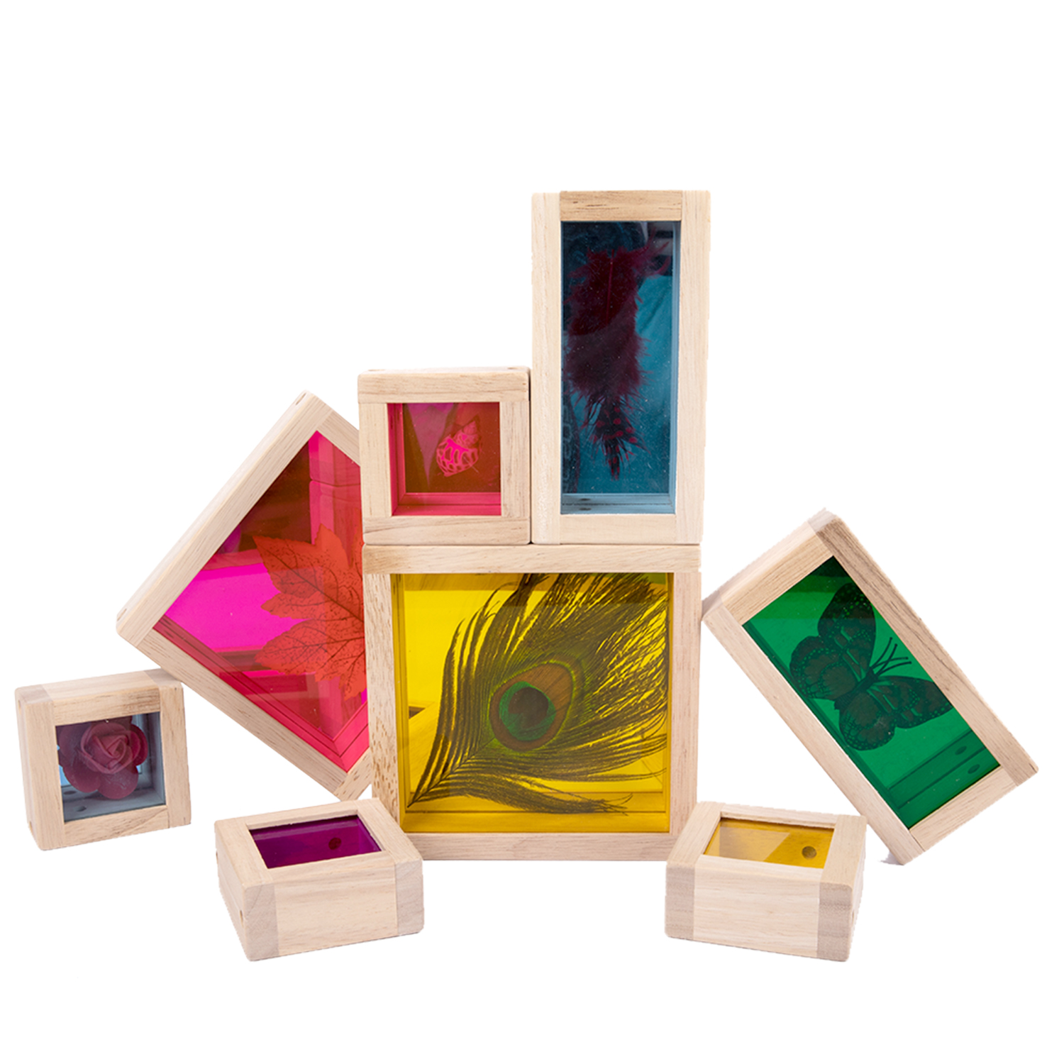 One complete set include smoothly solid wood frame and colorful acrylic windows; Place some things into these blocks for obeservation. Used for discovery the color and lamp house games activity. Also put some small stones / small beads / small twigs / small leaves and small toys into these blocks. Made these things fixed in each block inside by moving 2 Pcs screws on the wooden frame.