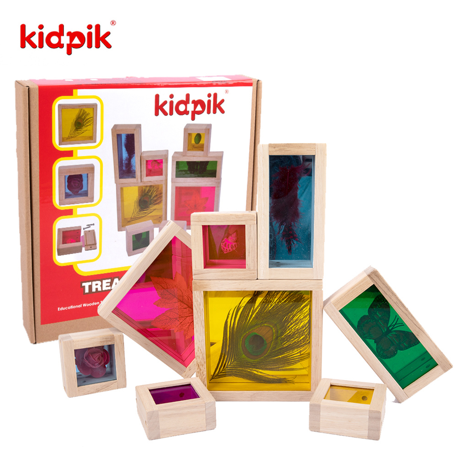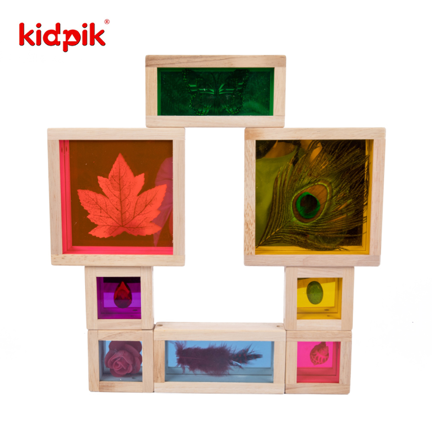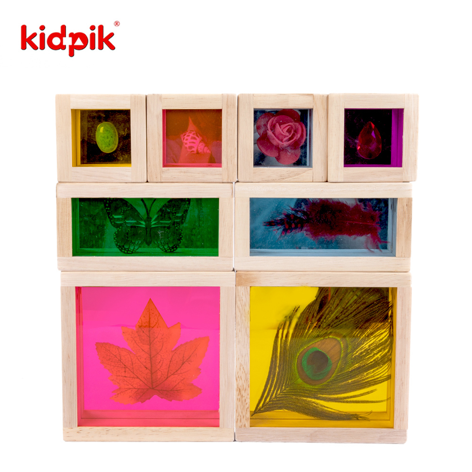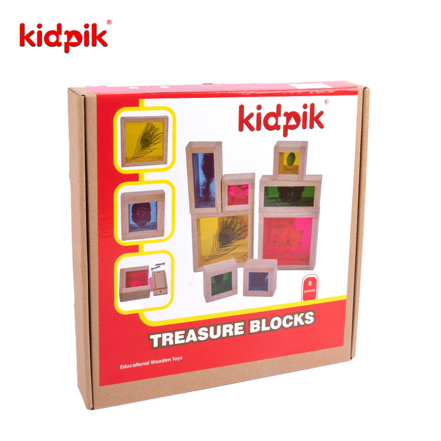 One complete set include smoothly solid wood frame and colorful acrylic windows; Place some things into these blocks for obeservation. Used for discovery the color and lamp house games activity. Also put some small stones / small beads / small twigs / small leaves and small toys into these blocks. Made these things fixed in each block inside by moving 2 Pcs screws on the wooden frame.