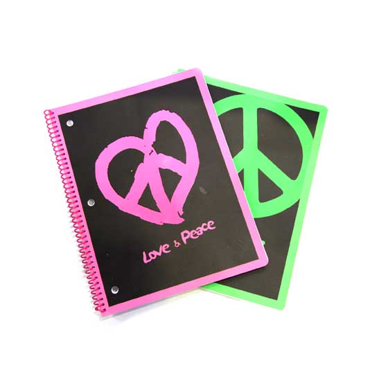 This 70-sheet notebook features a black cover with brilliantly colored rims and patterns. It also comes with letters of “LOVE & PEACE” for highlighting the theme. This spiral-bound notebook is ideal for school or office use.