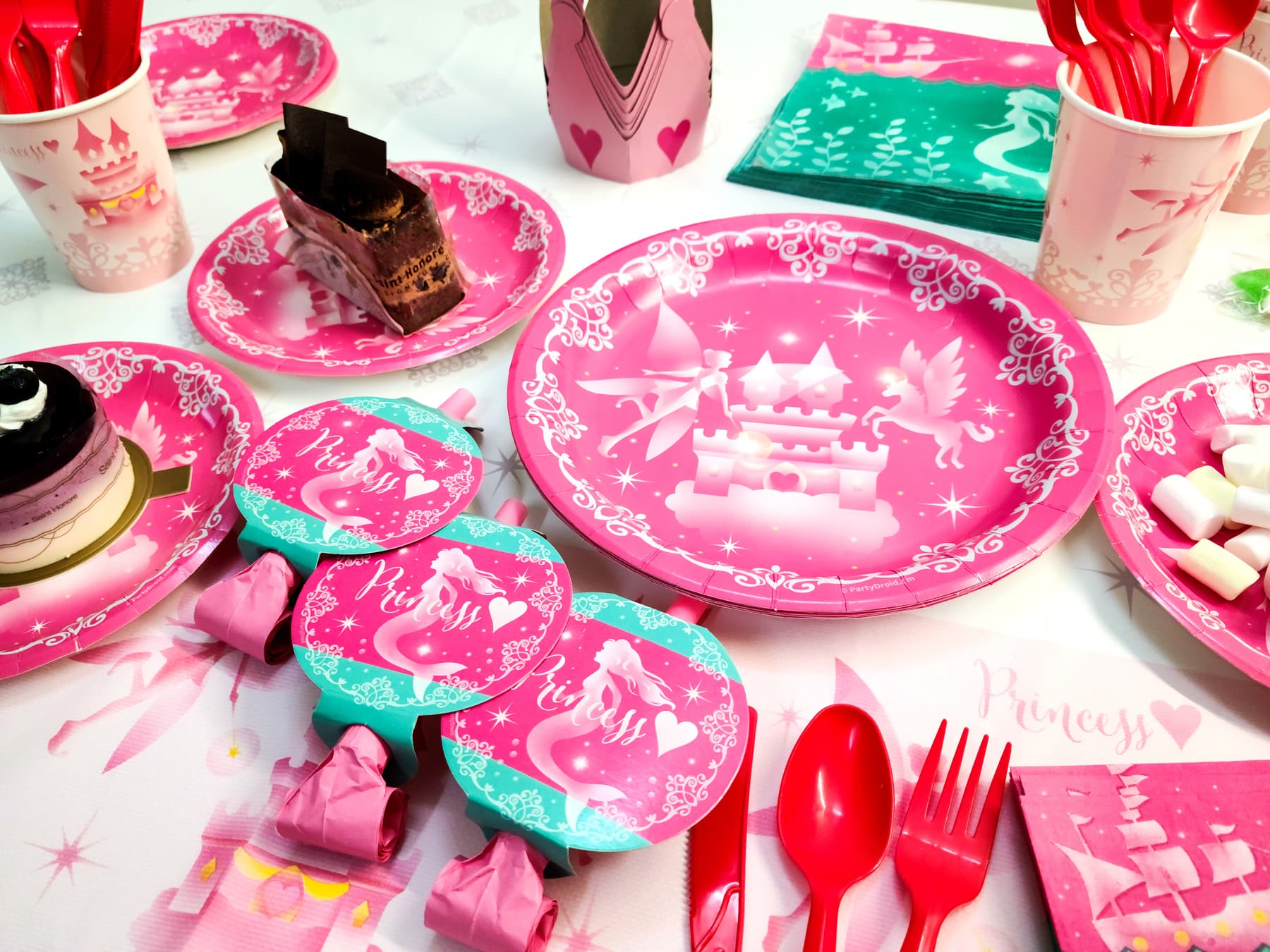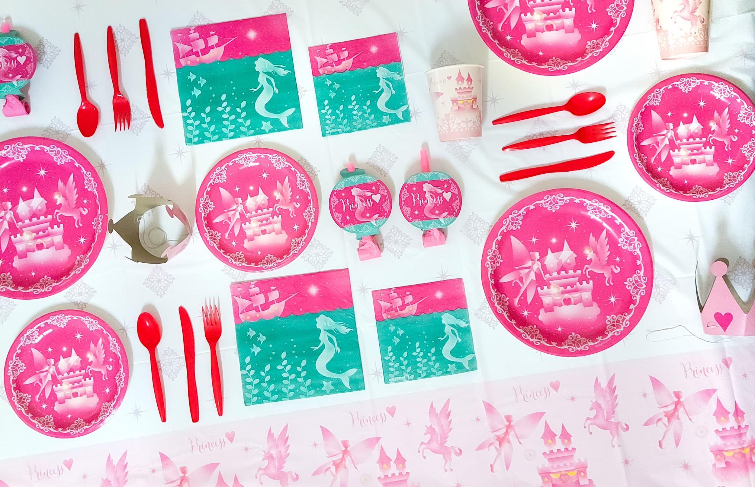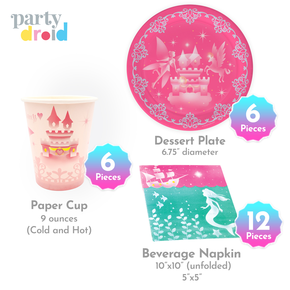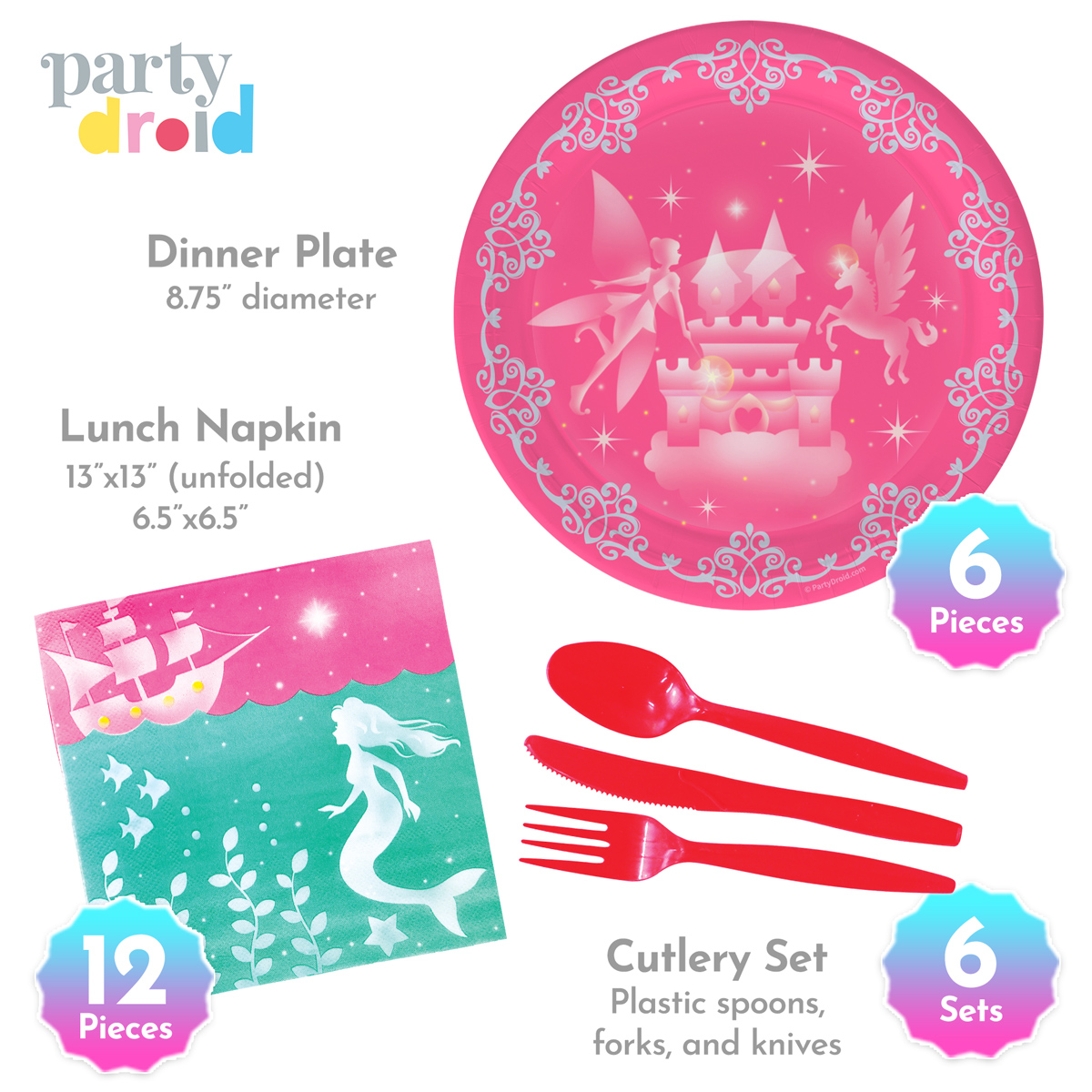 ALL IN ONE DISPOSABLE DINNERWARE PARTY SUPPLIES KIT INCLUDES: 1Pcs 52Inch x 96Inch Tablecloth, 6Pcs 8.75Inch Dinner Plates, 6Pcs 6.75Inch Dessert Plates, 12Pcs Luncheon Napkins, 12Pcs Beverage Napkins, 6Pcs 9oz Hot/Cold Cups, 18Pcs Plastic Cutlery, 6Pcs Cone Hat, 6Pcs Blowouts, 1Pcs 8Feets DIY Letter-banner And 1Pcs 32Inch DIY Balloon Table Centerpiece
