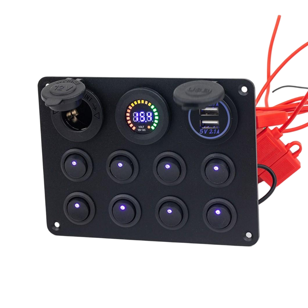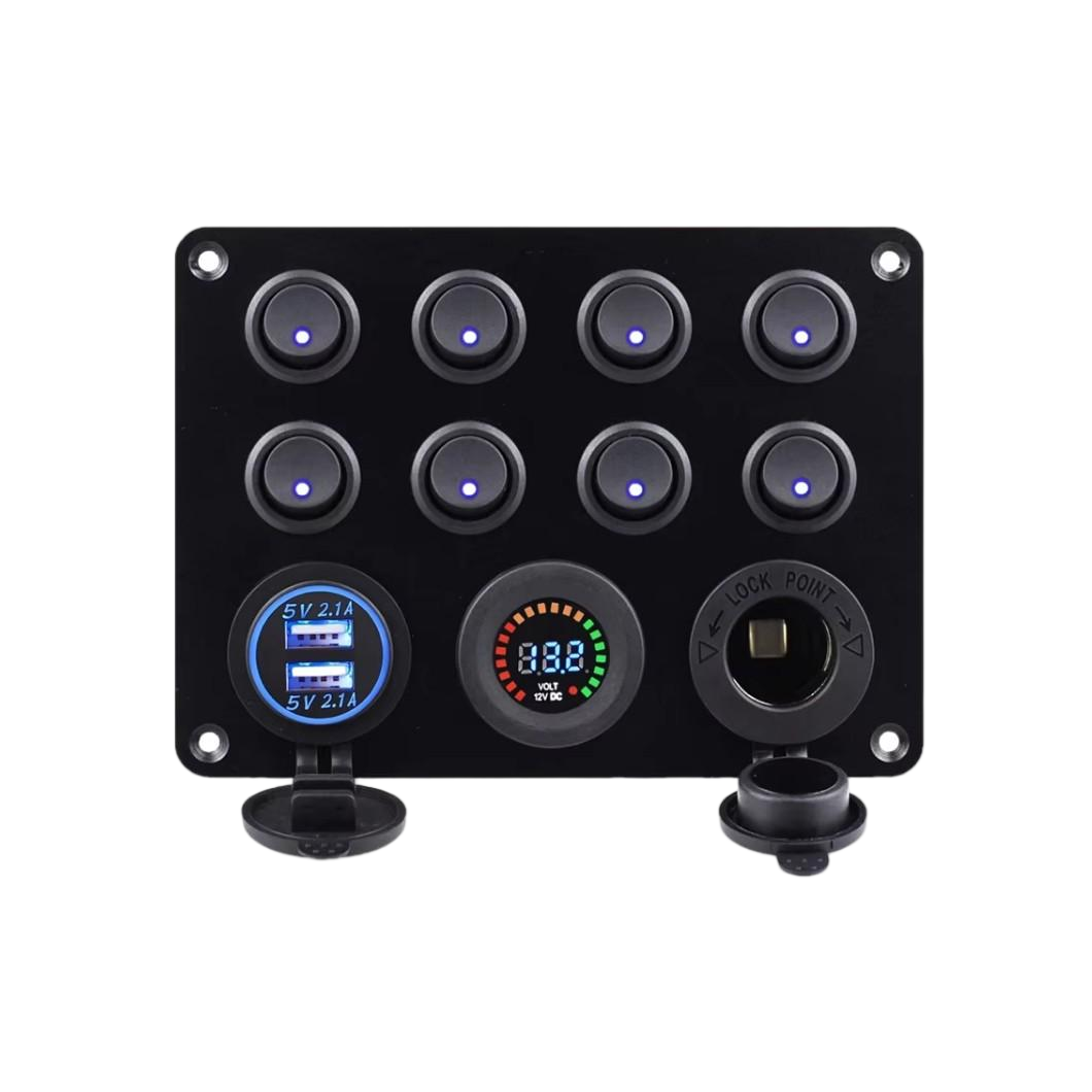 The 8 Gang Multi-Function Rocker Switch Panel is not only a power hub but also a reliable control center for various 12V electronic systems. The panel includes 8 LED toggle switches with a 15A fuse, providing overload, over-current, and short circuit protection. This ensures the safety and longevity of your electronic devices, making it suitable for use in marine boats, RVs, and even household applications. The versatility of this panel makes it an ideal choice for those with multi-functional requirements, catering to both 12V and 24V systems. Whether you need to control LED lights or other electronic systems, this panel offers a convenient and efficient solution.USB socket safety protection: It's certified by CE & ROHS with overload, over-current and short circuit protection to ensure charging safety, meanwhile, built-in converse connection protection that ensures the circuit won't be burnt out if wrong wiring.
