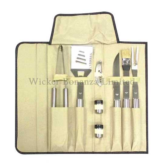 Showcased is an 8-piece BBQ tool set that includes a pair of tongs, a spatula, a knife, a grill brush, a fork, etc. Made of polished stainless steel, they boast robust construction with lasting endurance. This BBQ tool set is perfect for a grill master.
