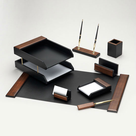 This wooden desk set consists of a pen stand, desk pad, memo holder, name card holder, pencil cup, letter holder, letter opener and letter tray. All the pieces are made of quality wood and finely polished for incredible sophistication. This refined set is particularly great for office uses.
