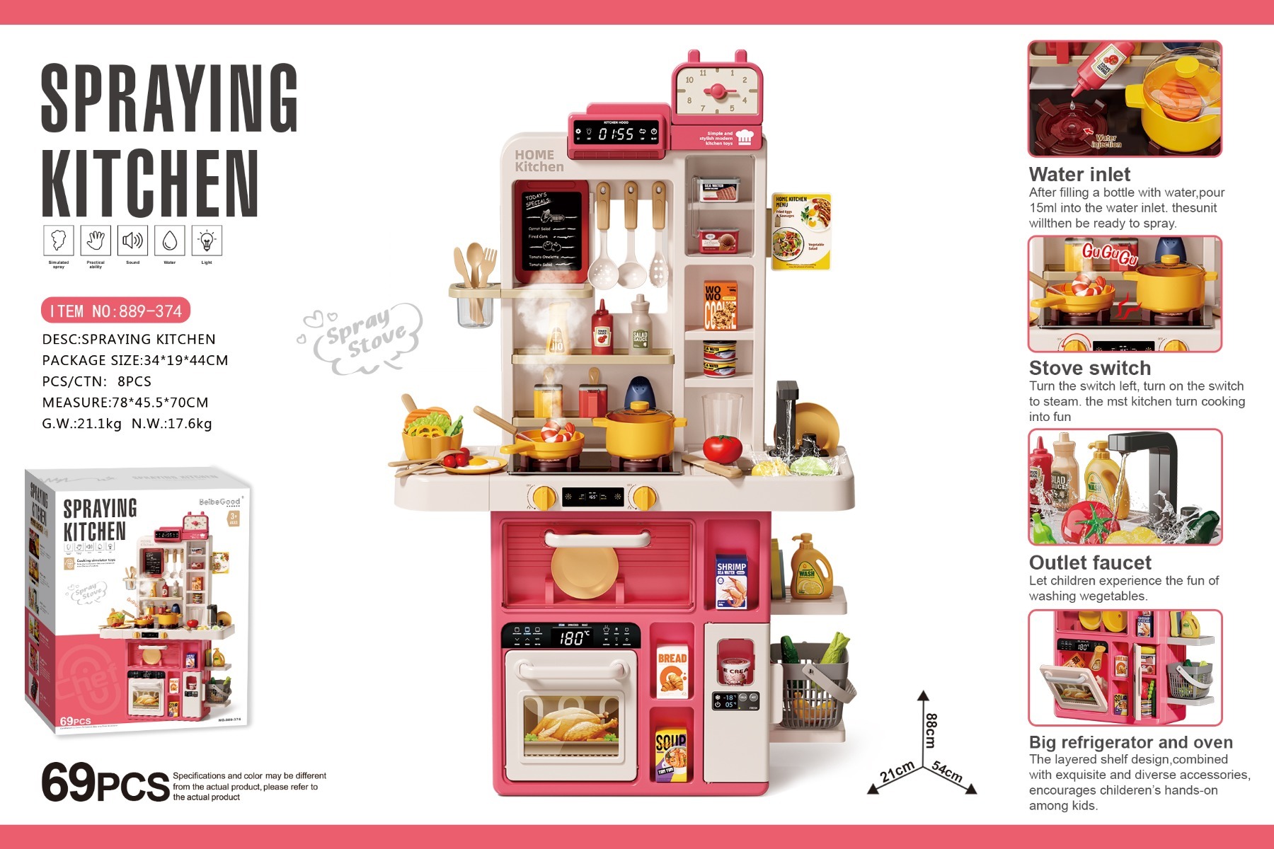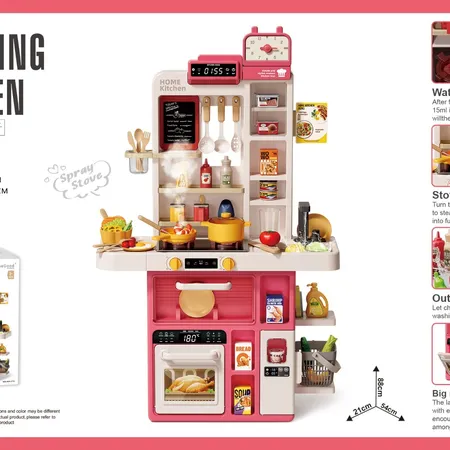 889-374 88CM SPRAY KITCHEN DELUXE VERSION (WITH SPRAY, ACOUSTO-OPTIC SOUND EFFECT, WRITING BOARD, WATER OUTLET FAUCET) 69PCS, NOT INCLUDING 3 * 1.5AA