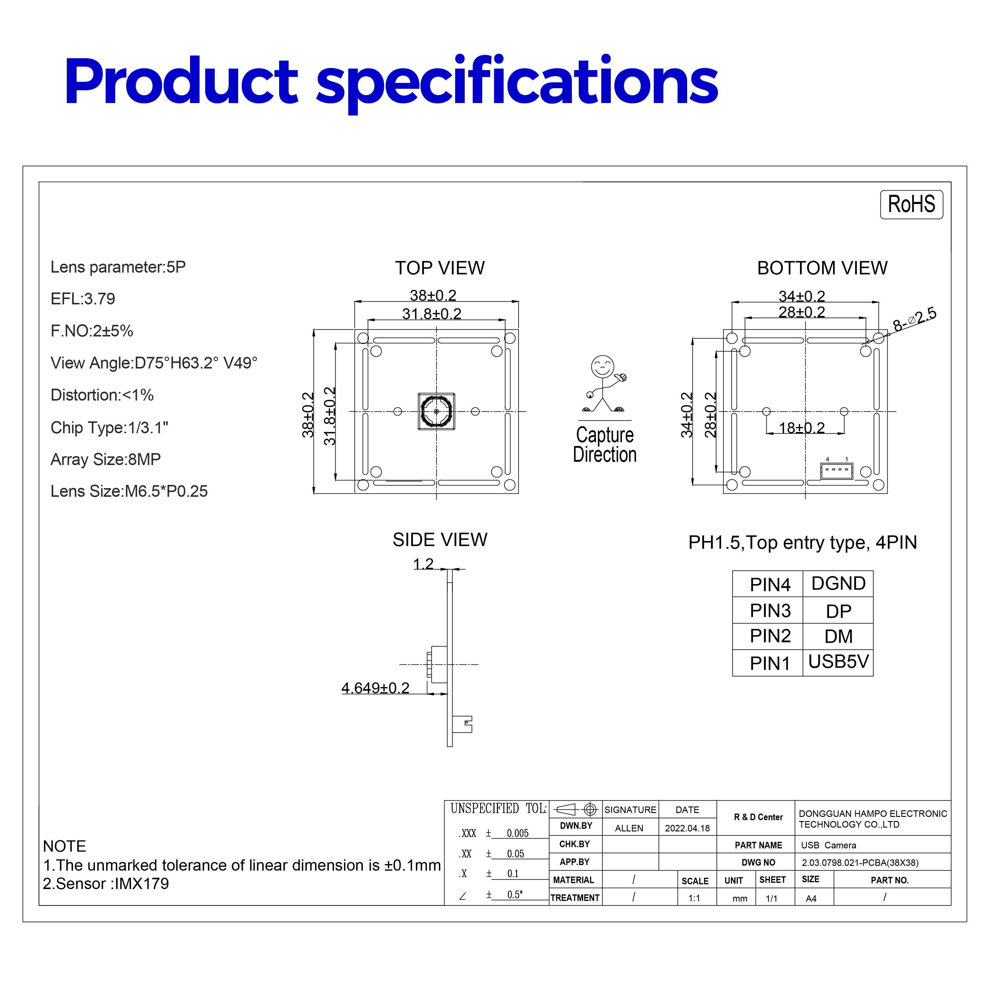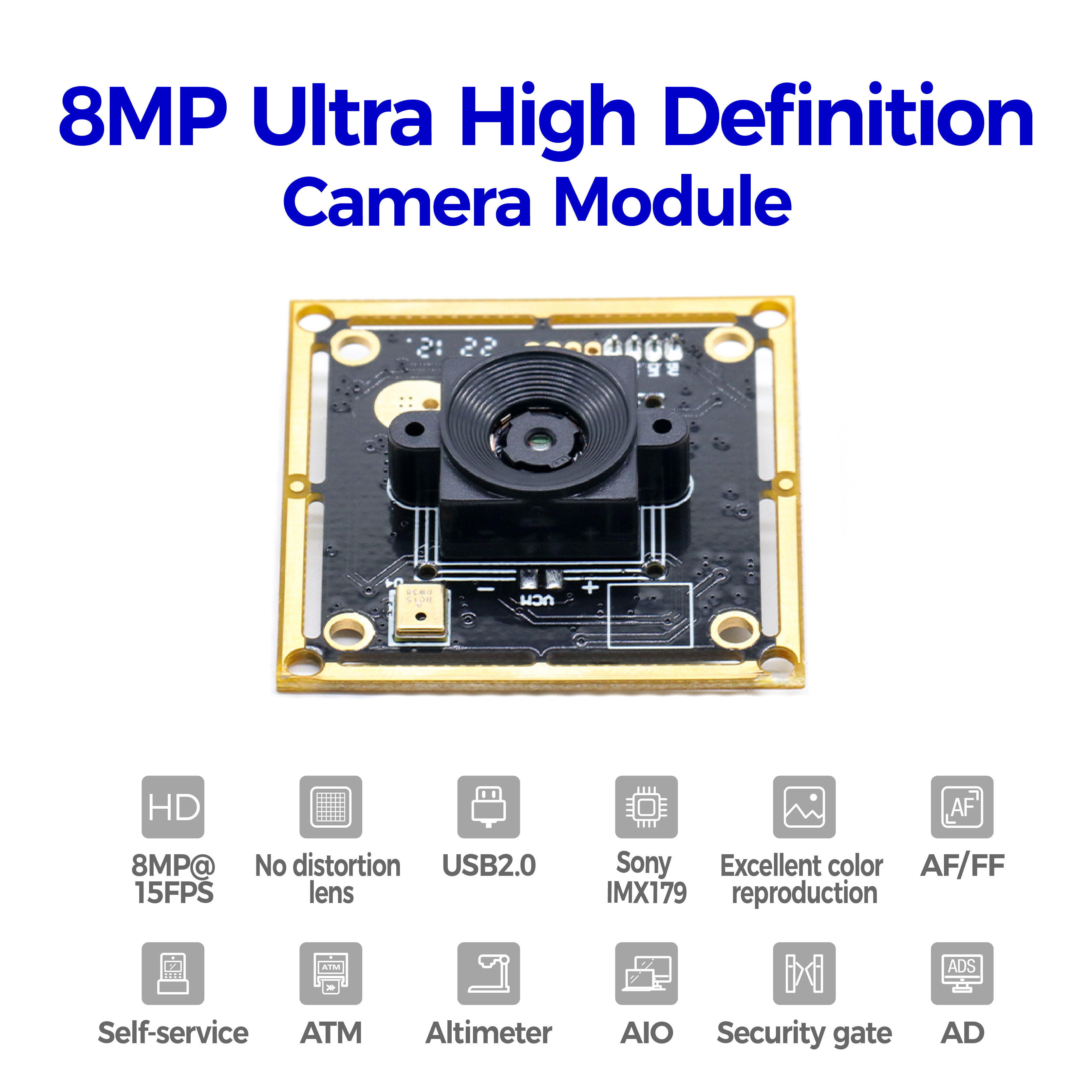 Hampo 003-0798 camera is a 8MP camera module supply crisp image and crystal clear video.High quality, stream media and record vivid, and providing incredible capture of clear images. This camera with high definition 3264*2448P and lower color reproduction deviation produce sharp image and accurate information.Widely application on document scanner, car and ship control, face matching, OCR components, all-in-one machine, advertising machines, automatic vending machine,industrial&medical equipment,robot project,teaching system,automobile data recorder,endoscope,etc.