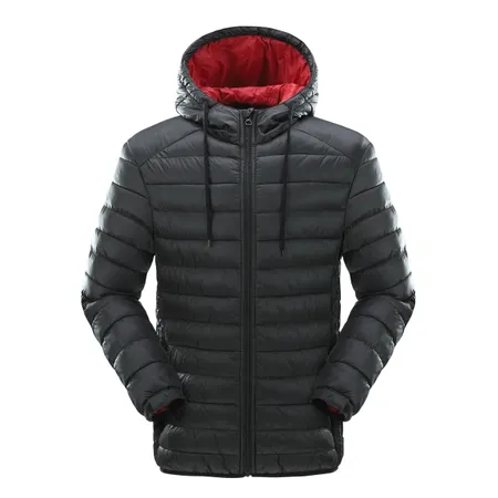 The image shows a black puffer jacket with a red-lined hood, designed for warmth and comfort in cold weather. The jacket features a front zipper and possibly additional snap buttons for closure. It has a quilted design, which is typical for puffer jackets, providing insulation. The hood is detachable, offering versatility in different weather conditions. The jacket also includes pockets, which are practical for carrying small items. The material appears to be water-resistant, making it suitable for outdoor activities. The overall design is functional and stylish, making it a practical choice for winter wear. The image also includes close-up views of the jacket's details, showcasing the quality and features of the garment.