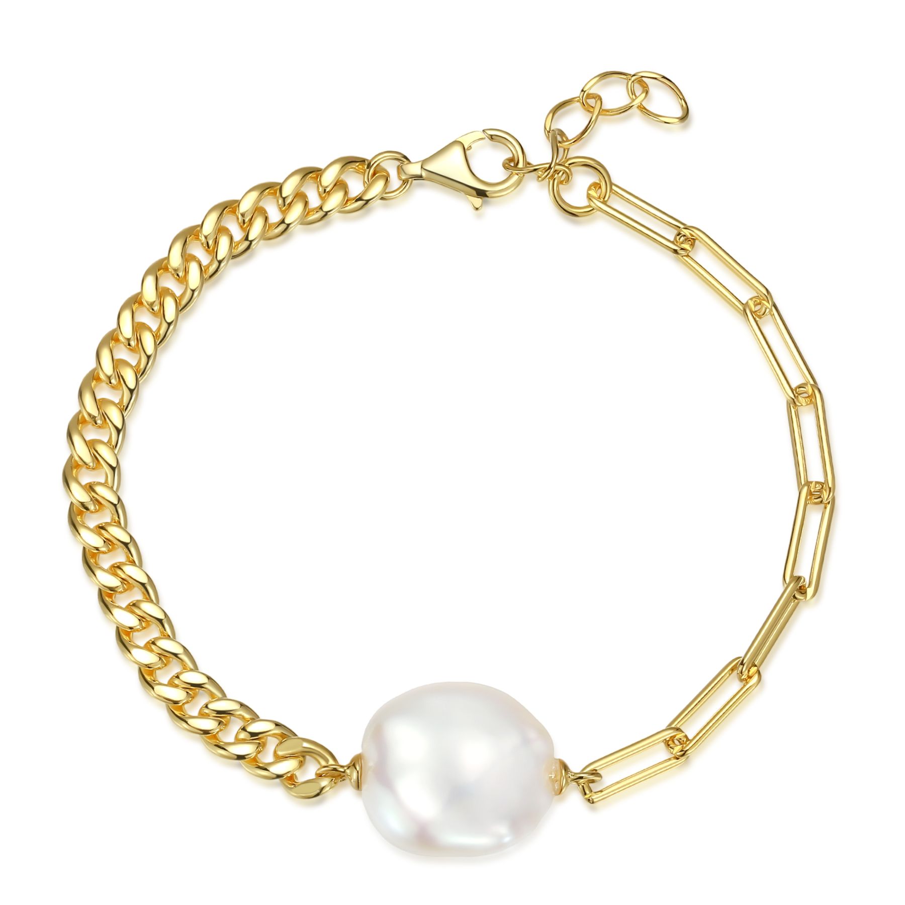 STERLING SILVER MIXED CHAIN BRACELET WITH 14-16MM KESHI BAROQUE FRESHWATER PEARL, 7"+1" (PEARL IN MIDDLE, BOTH SIDE DIFFERENT CHAIN)