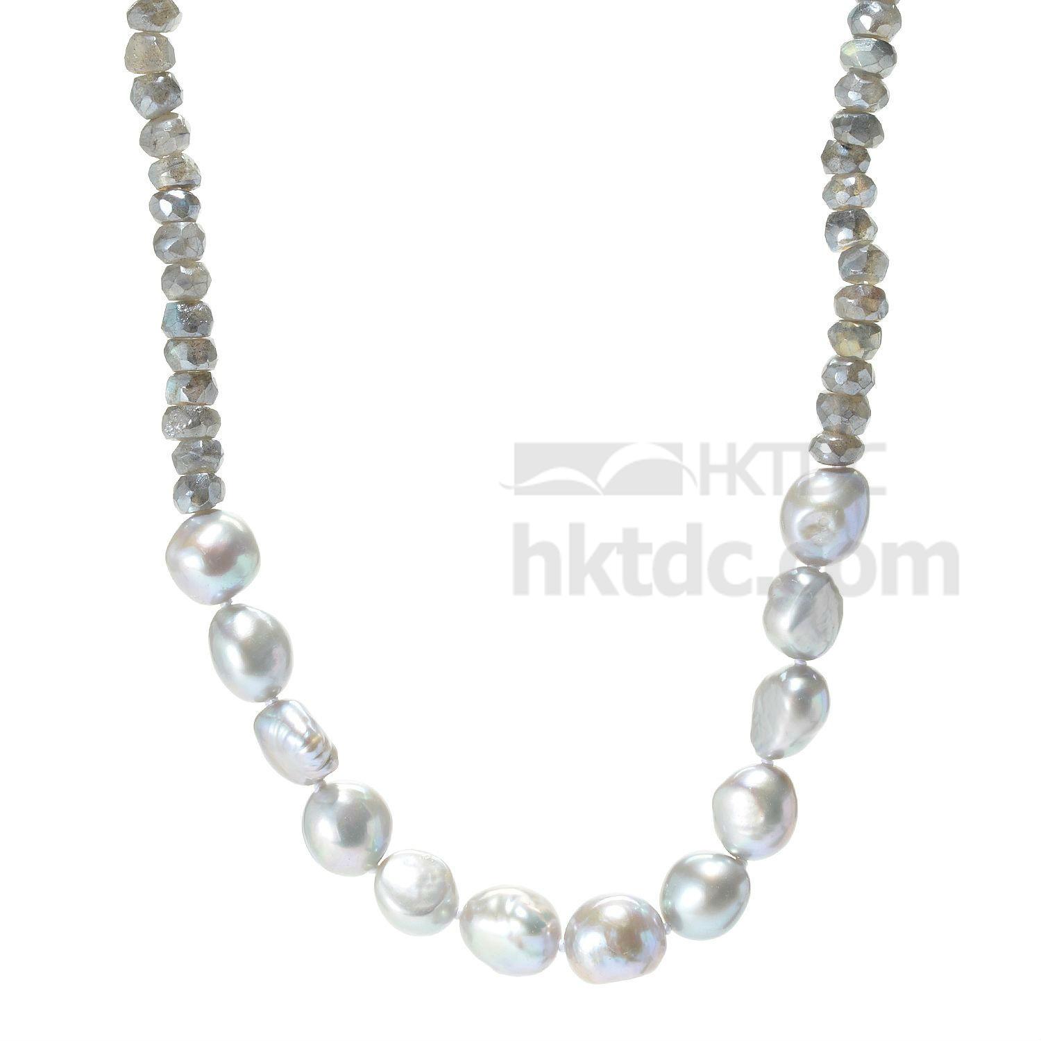 8-9mm pearl and 6mm faceted rondelle shaped rhodium coated labradorites