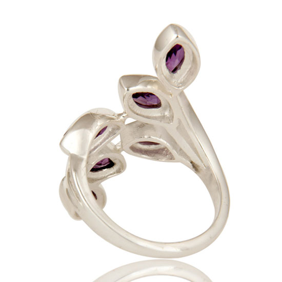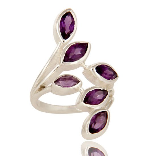 This is a 925 sterling silver amethyst statement ring with a foliage pattern. The amethyst is carefully polished to shine with a bright purple hue. It adds grace and charm to your evening outfit.
