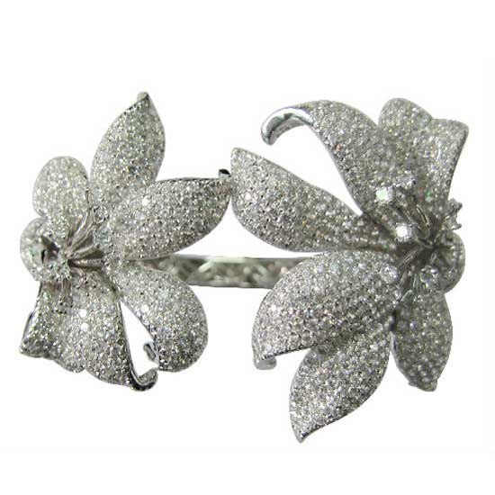 Pictured is a 925 silver bangle catching eyes with two dramatic flowers paved with sparkling stones. The scintillating floral design highlights the fluidity of the petals. The heart-robbing silver bangle lines a woman’s wrist with a touch of romance.