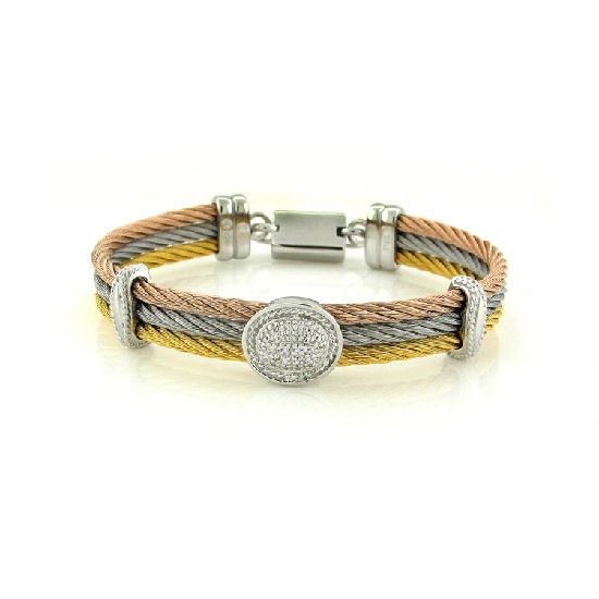 This charming bangle presents a three-tone design in golden, silver and rose-gold colors. The clean adornments with silver and diamond are elegant and classy. This fine piece of jewelry is a truly delightful gift.