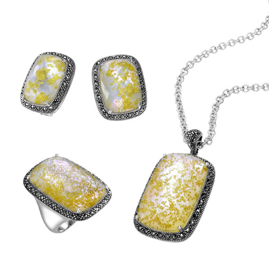 This is a jewelry set that comes with a necklace, a finger ring and a pair of earrings. Each piece is made of 925 sterling silver with an 18K gold leaf and a white MOP doublet stone embellishment. This jewelry set will add glamor and charm to your look.