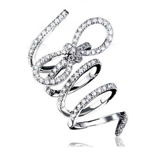 The 925 silver ring is fully paved with white cubic zirconia stones. The exquisite ribbon-bow design gives it a touch of femininity and elegance. This ring will add a little sparkle to your look.