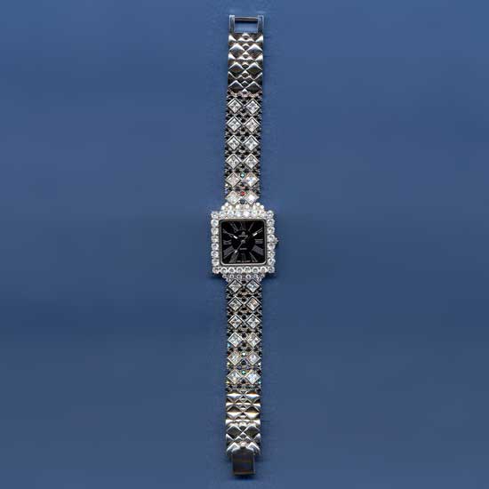 Featured here is a timepiece made with quality 925 sterling silver. The timepiece presents itself in a design that suggests timeless elegance. The watch case and the band are set on sparkling CZ stones for an additional touch of style.