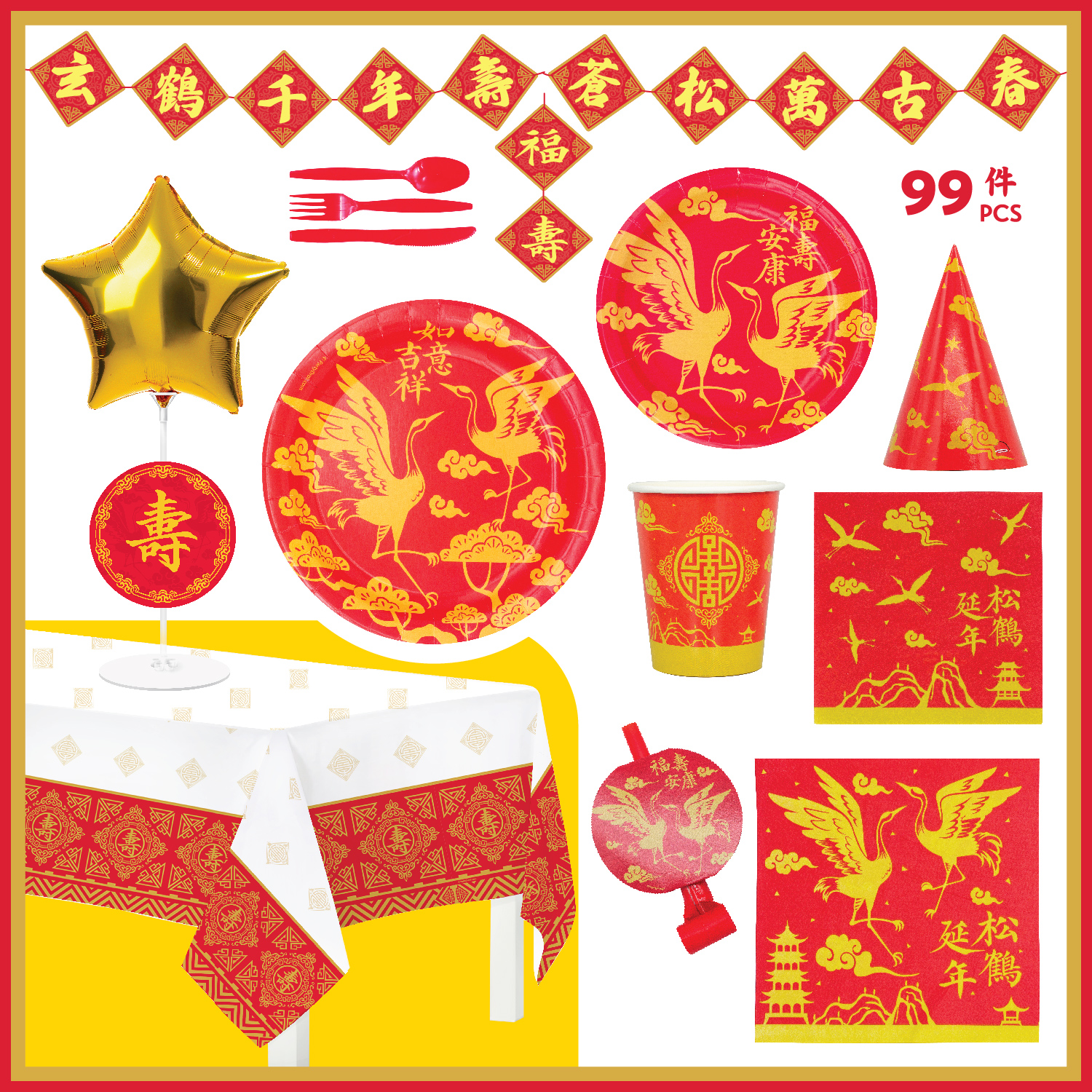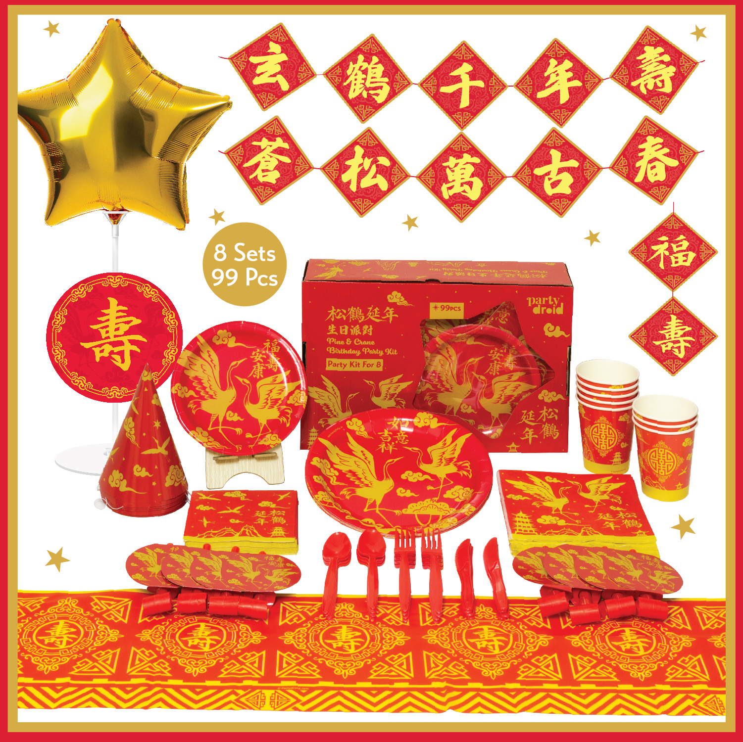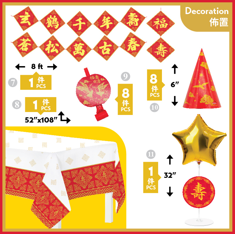 - Total 99 pcs, 8 sets of tableware and decoration: Table Cover, Dinner Plates, Dessert Plates, Luncheon Plates, Dessert Plates, 9oz Cups, Cutlery; ‘Happy Birthday’ Letter Banner, ‘Happy Birthday’ DIY Balloon Centerpiece, Party Hats, Party Blowers.