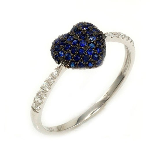 This heart-theme ring’s band is crafted with 9k white gold. The heart is assembled with diamonds and blue sapphires. This ring simply delights with its feminine yet youthful appearance.