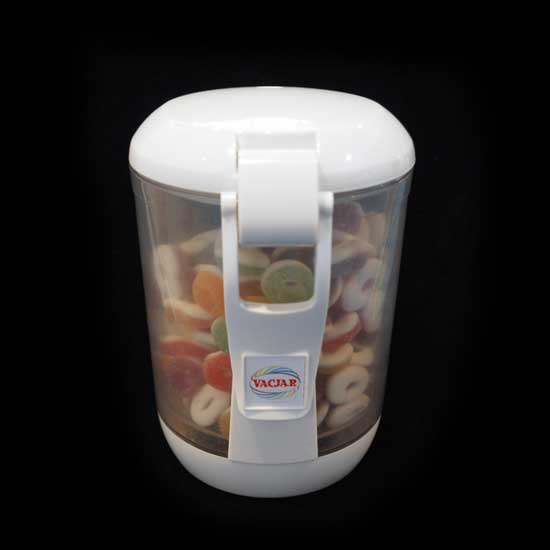 This ABS vacuum jar features a transparent body with a white lid and a white bottom. The airtight closure ensures the freshness of the snacks and food inside. There are three different colors available for customers to choose from.