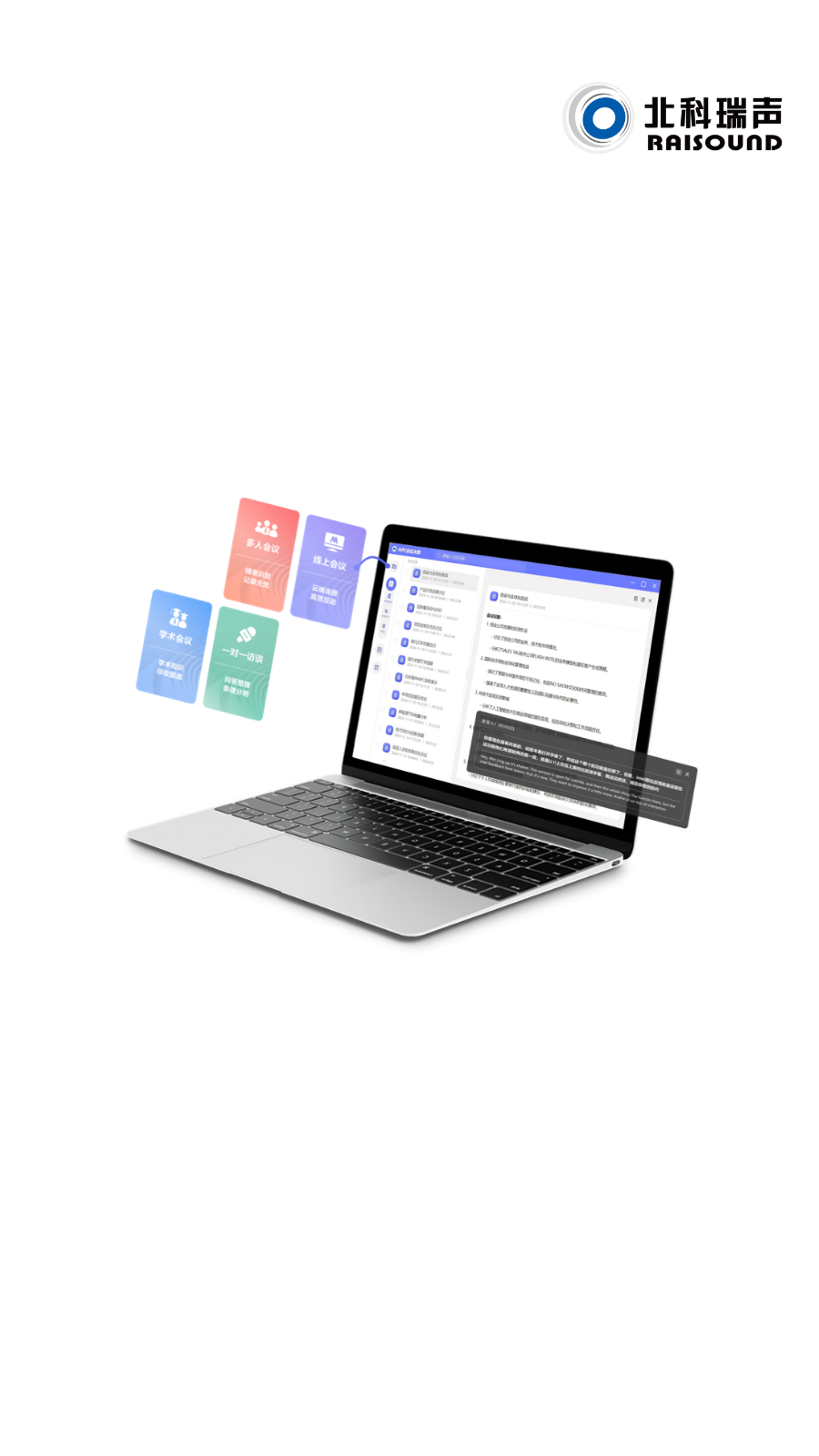 AIPC Meeting Master adopts the self-developed Qianyue LLM and Intel Core Ultra computing power, supporting offline edge processing. It provides real-time transcription, translation, speaker separation, minutes and to-do generation.