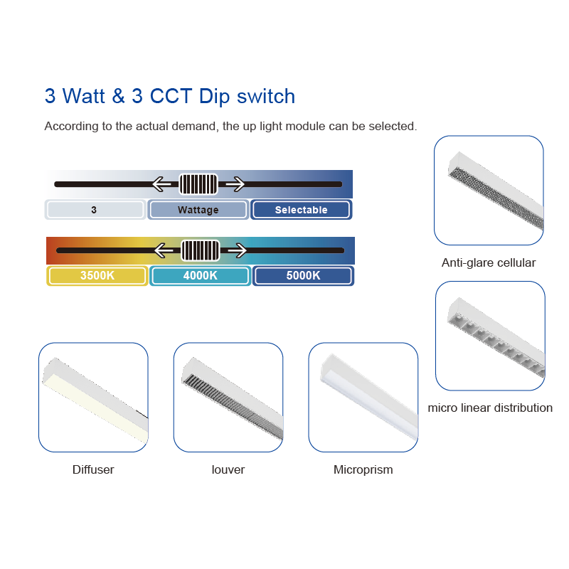• A variety of optical cover are available : Diffuser,Anti-glare honeycomb, louver, Micro linear,Microprism distribution