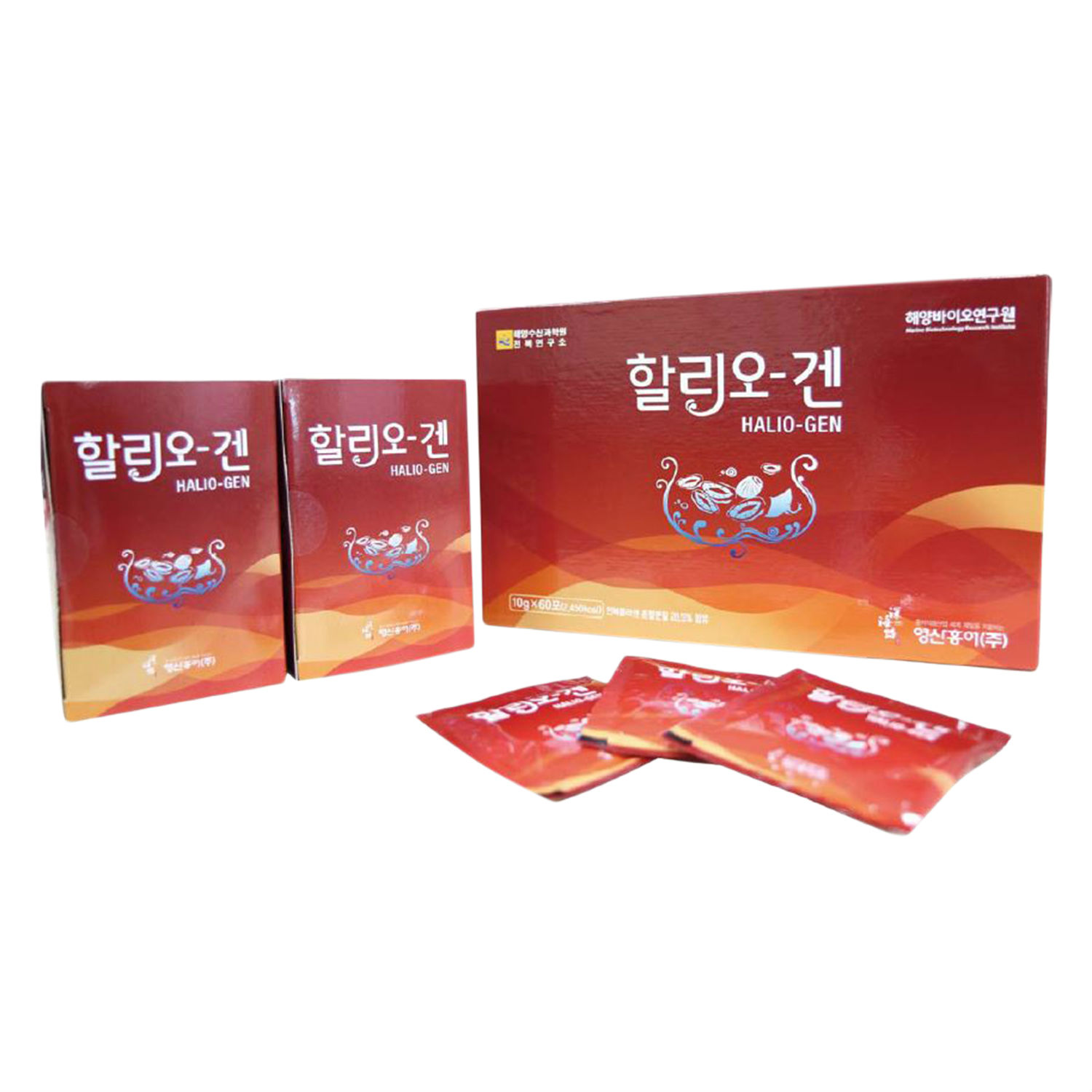 Halio-gen is a compound of Haliotis (scientific name of abalone) and collagen. This powder type product allows people to enjoy the collagen of abalone conveniently. The target of this product is women in their 30s, and this product is good for skin elasticity, beauty, and blood circulation.
