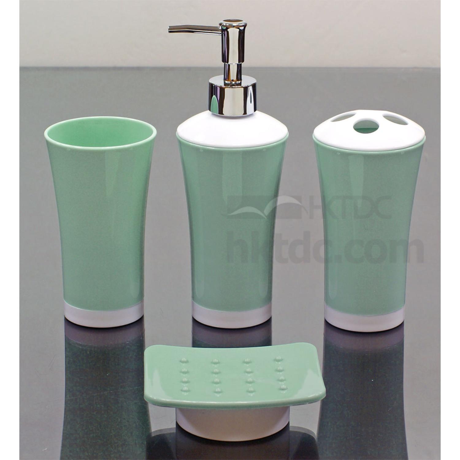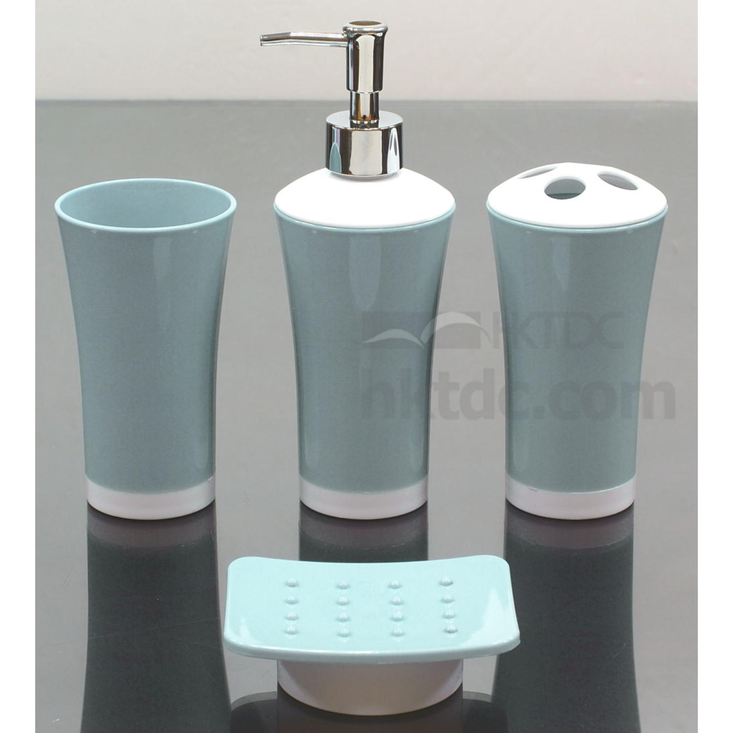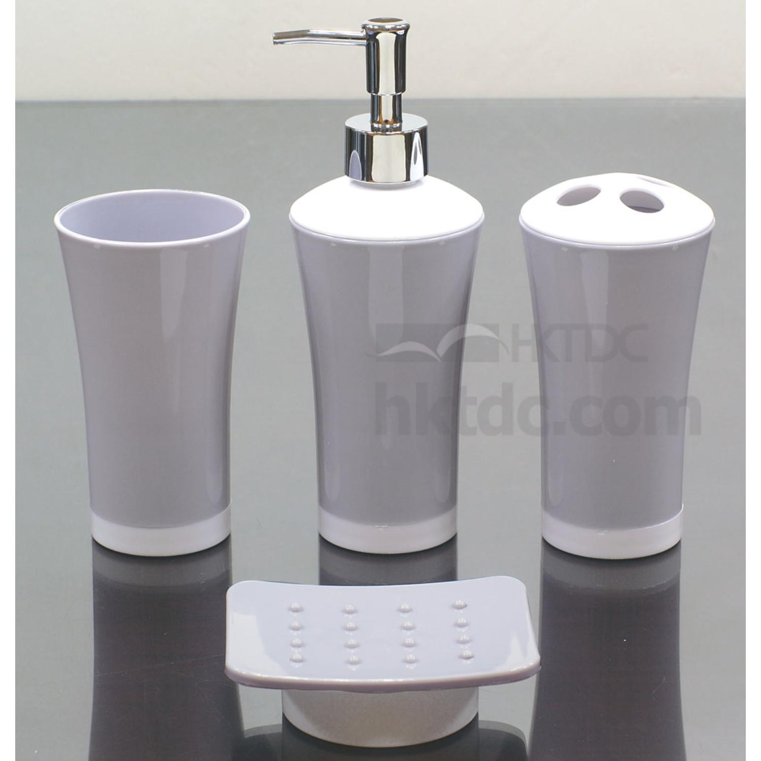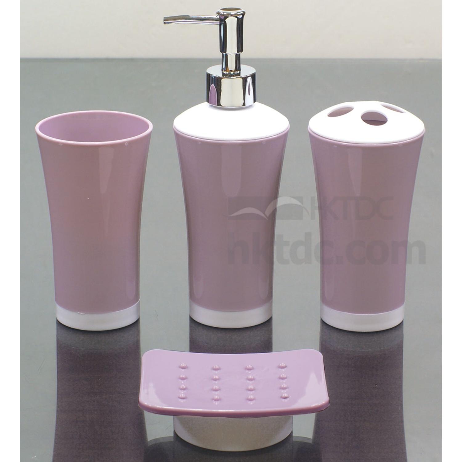 Presented here is a bathroom set in high-quality acrylic. It comes with a tumbler, a soap dispenser, a toothbrush holder and a soap dish. This acrylic bathroom set is ideal for home use.
