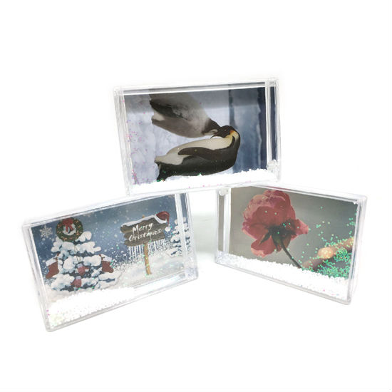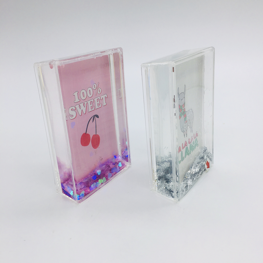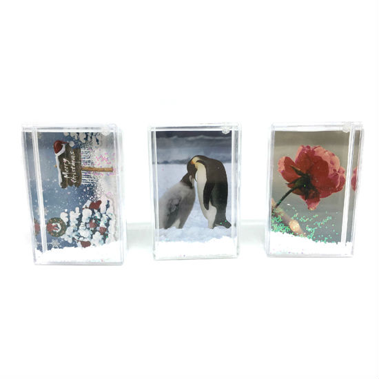 This photo frame snow globe is made of acrylic and filled with non-toxic and eco-friendly liquid inside .