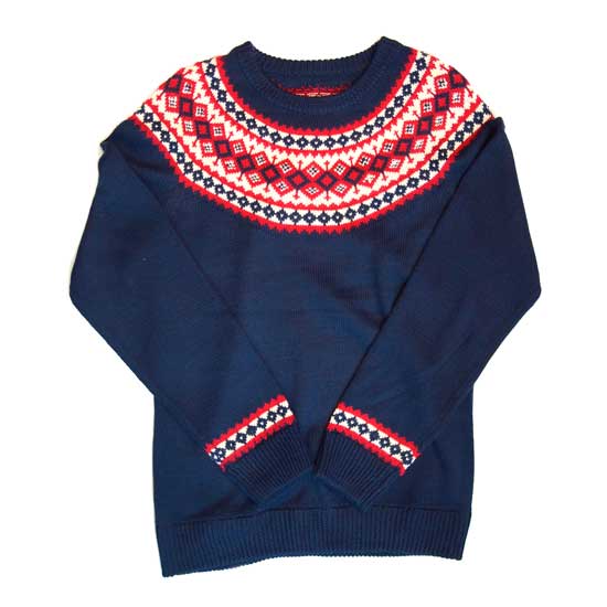 This blue hued pullover features red and white toned geometry patterns along the shoulder and the front and at the sleeves for a joyful touch. The pullover is constructed from wool and acrylic for added protection in cold days. This good-looking pullover makes a great addition for updating your look.