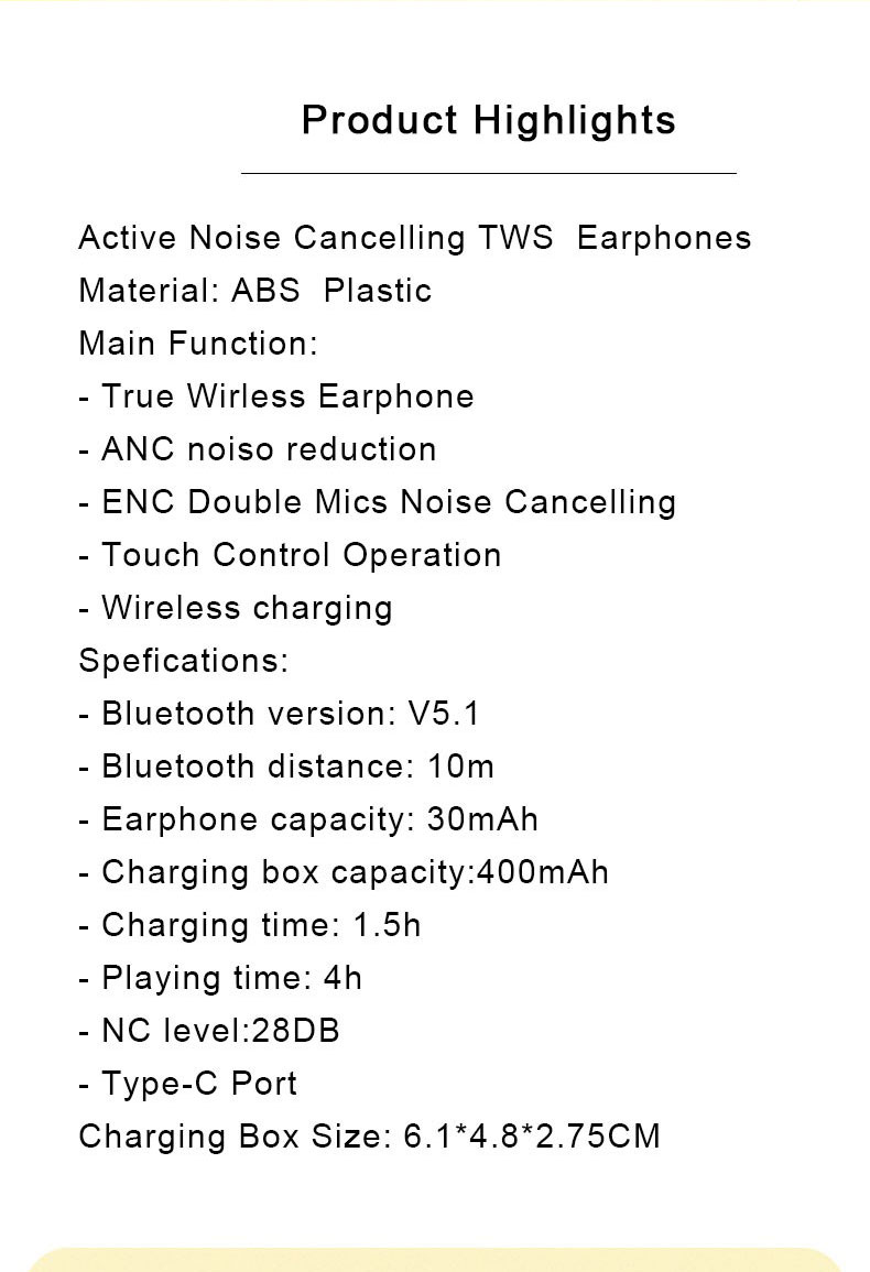 主要功能: - 真正的无线耳机 - ANC 降噪 - ENC 双麦克风降噪 - 触摸控制操作 - 无线充电