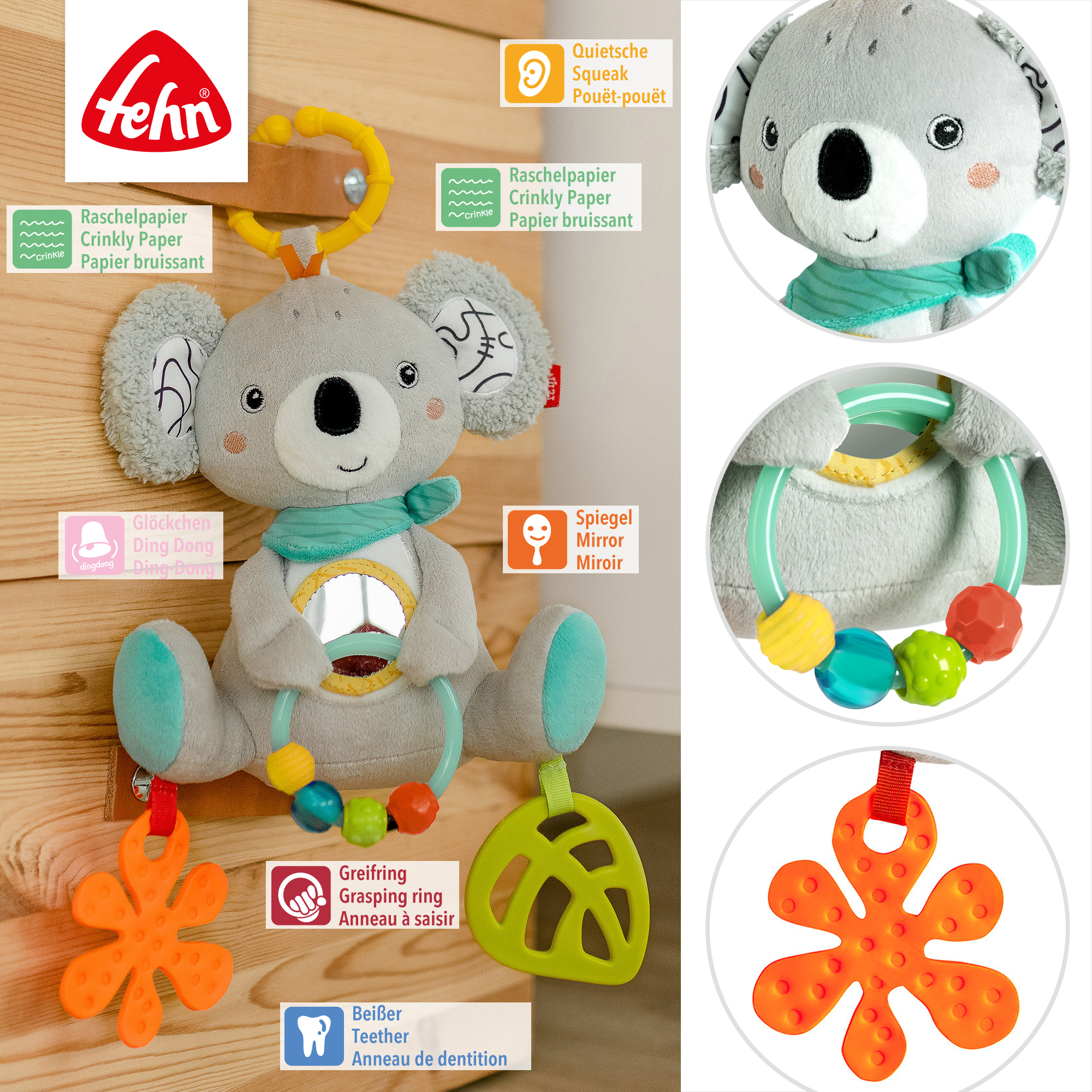 Educational fun at home and on the go: The colourful activity koala from the DoBabyDoo collection can be attached flexibly to the pram, baby car seat or cot with the practical C-ring. The exciting play features of the colourful play animal ensure good mood everywhere: little bell, squeak & crinkly paper stimulate baby's spirit of discovery & curiosity and promote the senses as well as motor skills. The bead ring with colourful beads and the exciting material mix of soft velours, printed fabric, plush invite to grasp, play and feel. A mirror trains self-perception in a playful way. The two soft teethers in green and neon orange help with teething. The soft koala is sure to quickly become baby's favourite. --- Educational toy with dingdong, teether, bead ring, mirror, squeak, crinkly paper & mix of materials / for babies and toddlers 3 months up / Top material: velvet, plush, printed fabric / Filling: polyester / ideal as a gift for birth, birthday or baptism for babies and toddlers / tested for safety by independent testing institutes