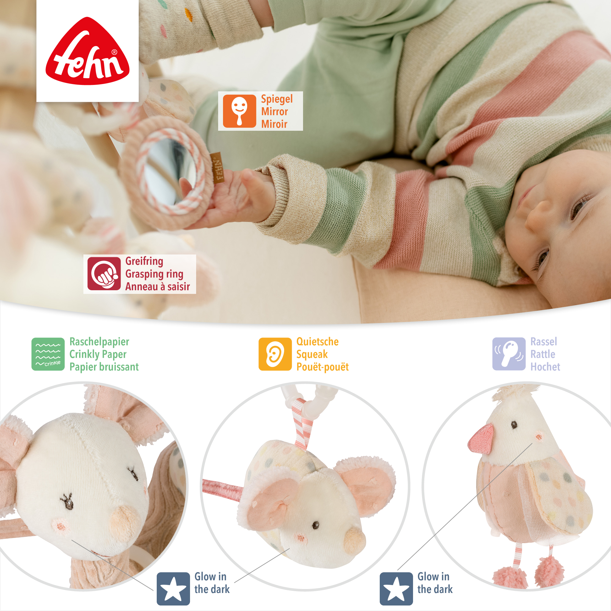 First discovery and playtime fun: The cute spiral mouse from the feehnLAND collection offers a variety of play options for at home and on the go. The stroller toy in the shape of an animal invites children to observe, play and grasp with its functions and colours and is also a real eye-catcher. The crinkly paper, a mirror, the squeak and an exciting rattle train baby's first hand-eye coordination, sense of hearing and touch as well as motor skills. The "glow-in-the-dark" embroidery shines in the dark. The cute mouse can be quickly and flexibly attached to the baby car seat, stroller, playpen and crib with two straps - making every adventure an exciting experience and ensuring that no journey is boring!