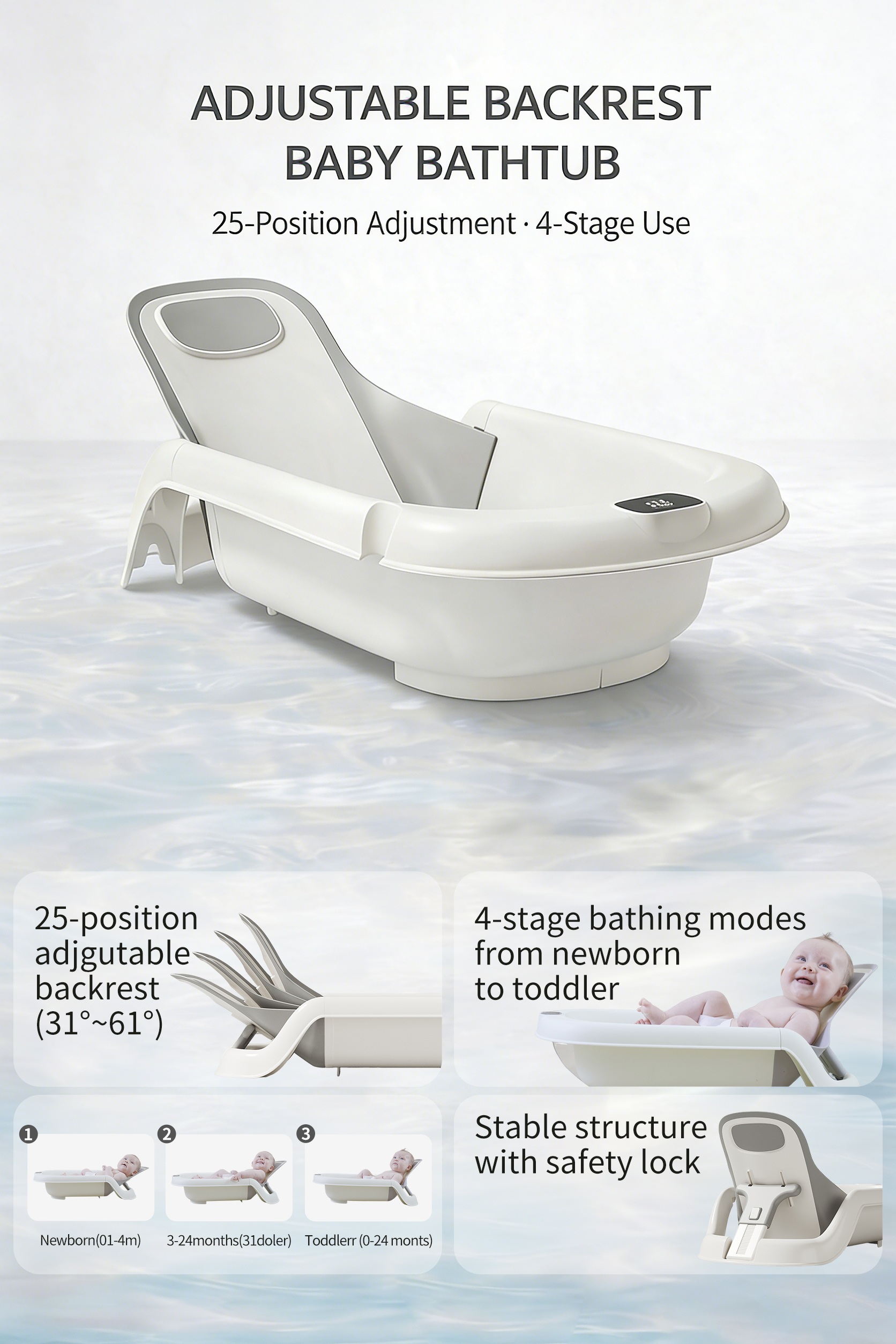 - Highly Customizable Backrest: 25-position adjustable recline (31°-61°) provides fine-tuned support for baby’s back and neck to reduce discomfort and strain during bath time