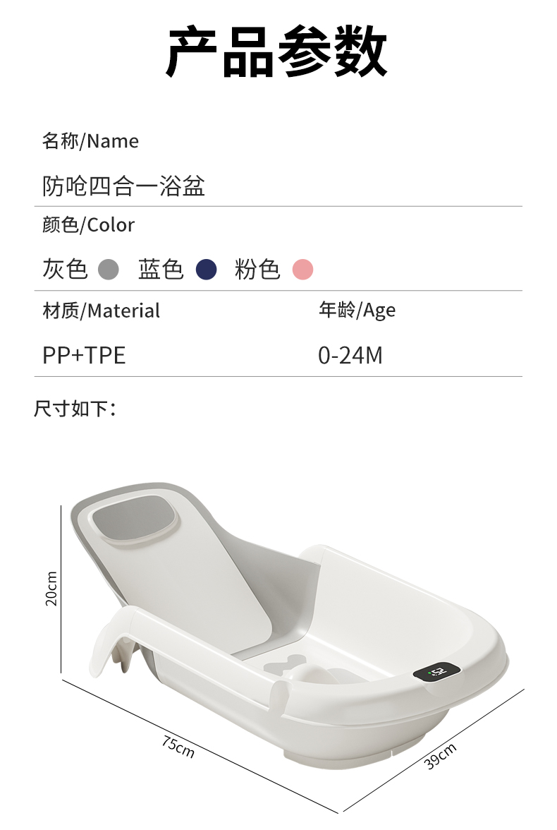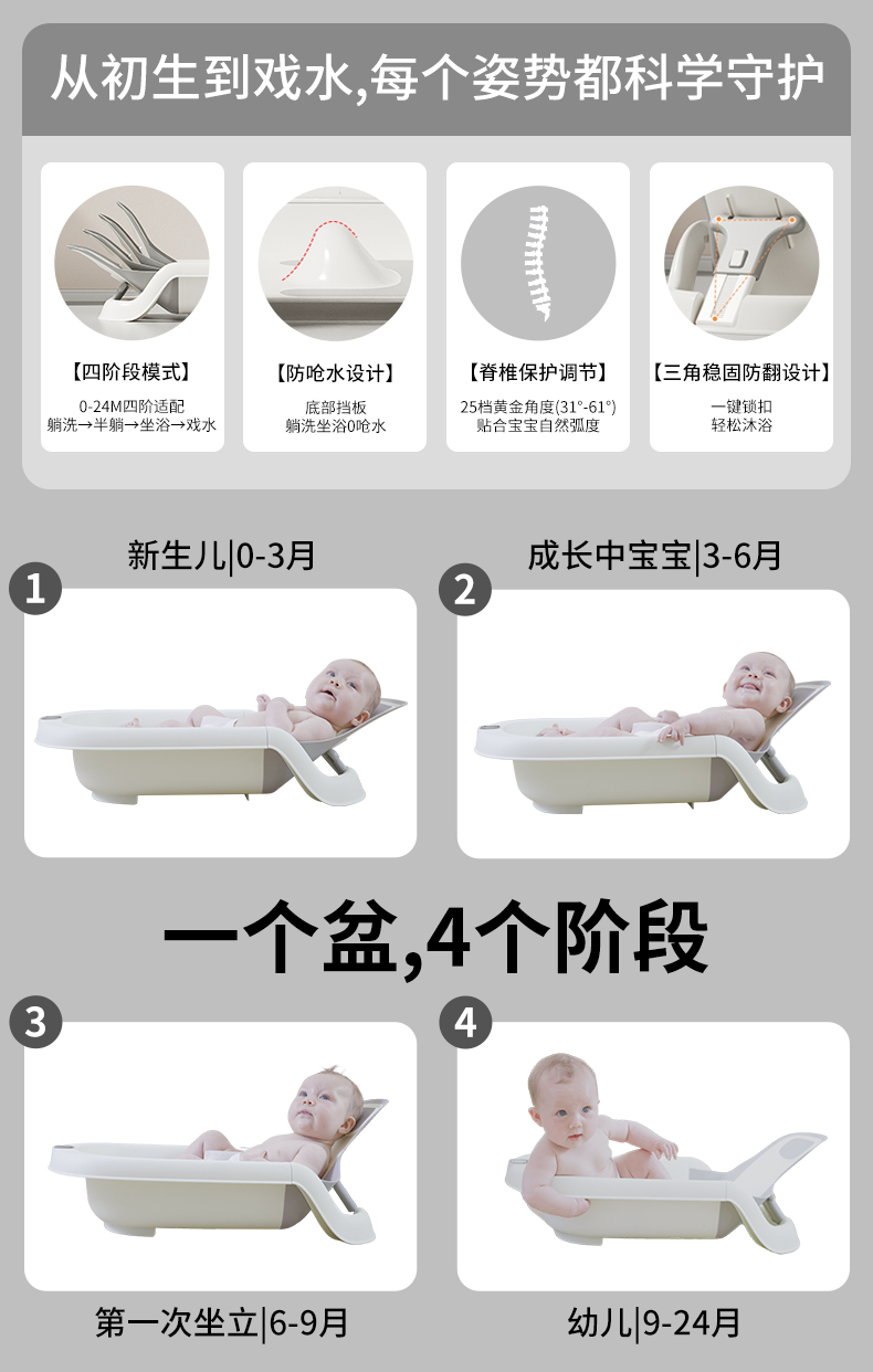 - 4-Stage Bathing Modes: Newborn, young infant, older infant, toddler