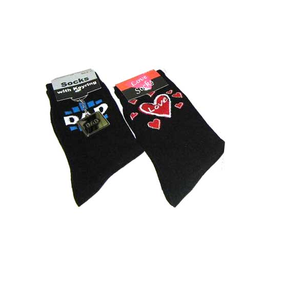 The adults' socks are embroidered with "dad" and "love" messages. They come with an additional keyring in a metal construction with pressed message. These socks are made of high-quality fabric to give a soft and comfortable fit.