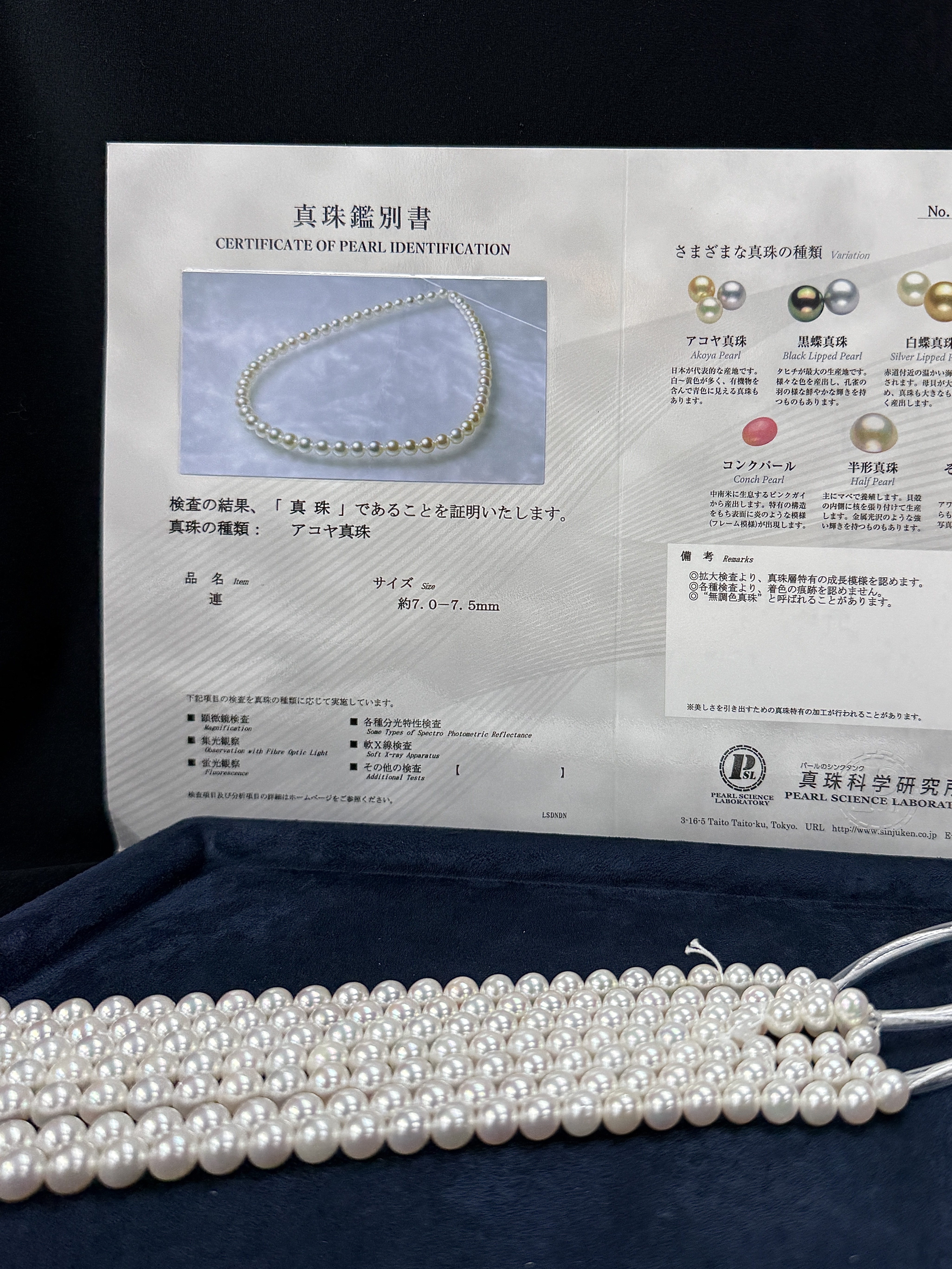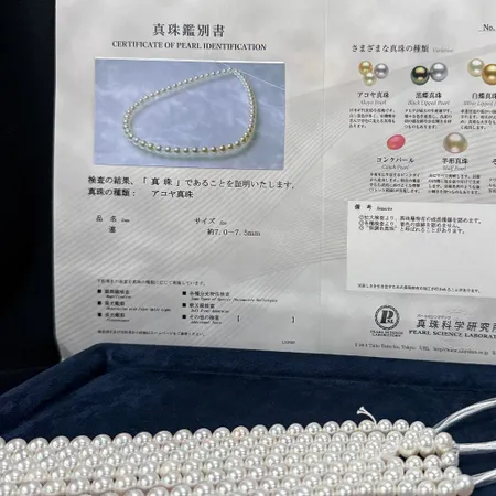 Strings come with certificates issued by Pearl Science Laboratory Japan, Grade SP , SS , SK, or FA.
