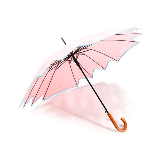 This alien umbrella stands out from the rest with its beautiful and unique design. It features a light pink canopy with an indented side in blue. This umbrella is completed with a strong frame.