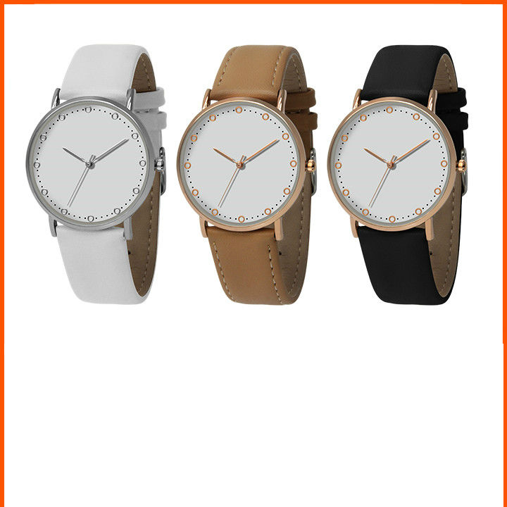 Alloy watches, leather strap, 3 ATM water resistant, stainless steel backcase, steel crown, brass plated 3 hands, Japan Seiko Movement.