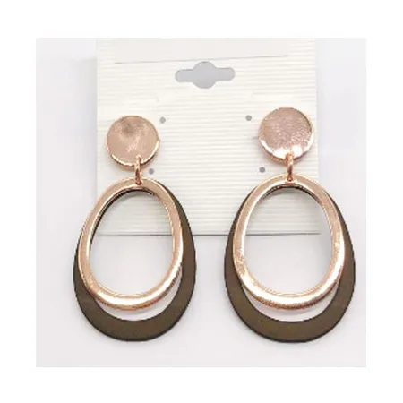 These are rose gold-tone oval drop earrings featuring a two-tone design with a metallic upper disc and a larger, darker (likely brown or black) lower oval element.