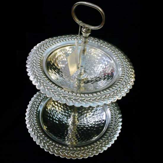 Displayed is an aluminum cake stand with a retro and elegant design to convey a touch of glamor. The aluminum material with a mirror finish is aesthetically appealing. This aluminum cake stand is a stylish idea to enhance a dining table in style.