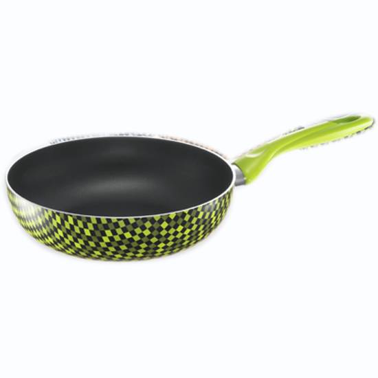 Shown here is a frying pan that is made of aluminum. This product features a non-stick property, making it extremely easy to clean. It is an ideal addition to your kitchen.