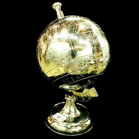 This aluminum globe features a tilted design. The finish is elegantly plated in luxurious gold. The latitudinal and longitudinal hollows and names of oceans and continents are hand etches.