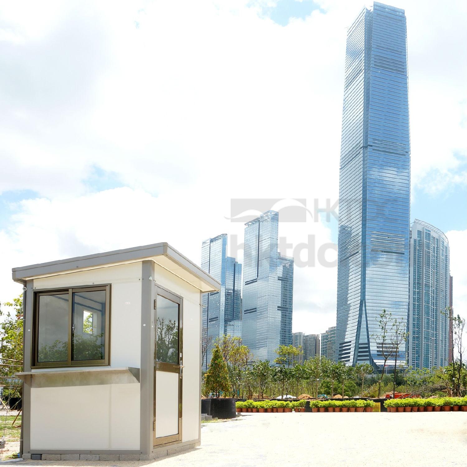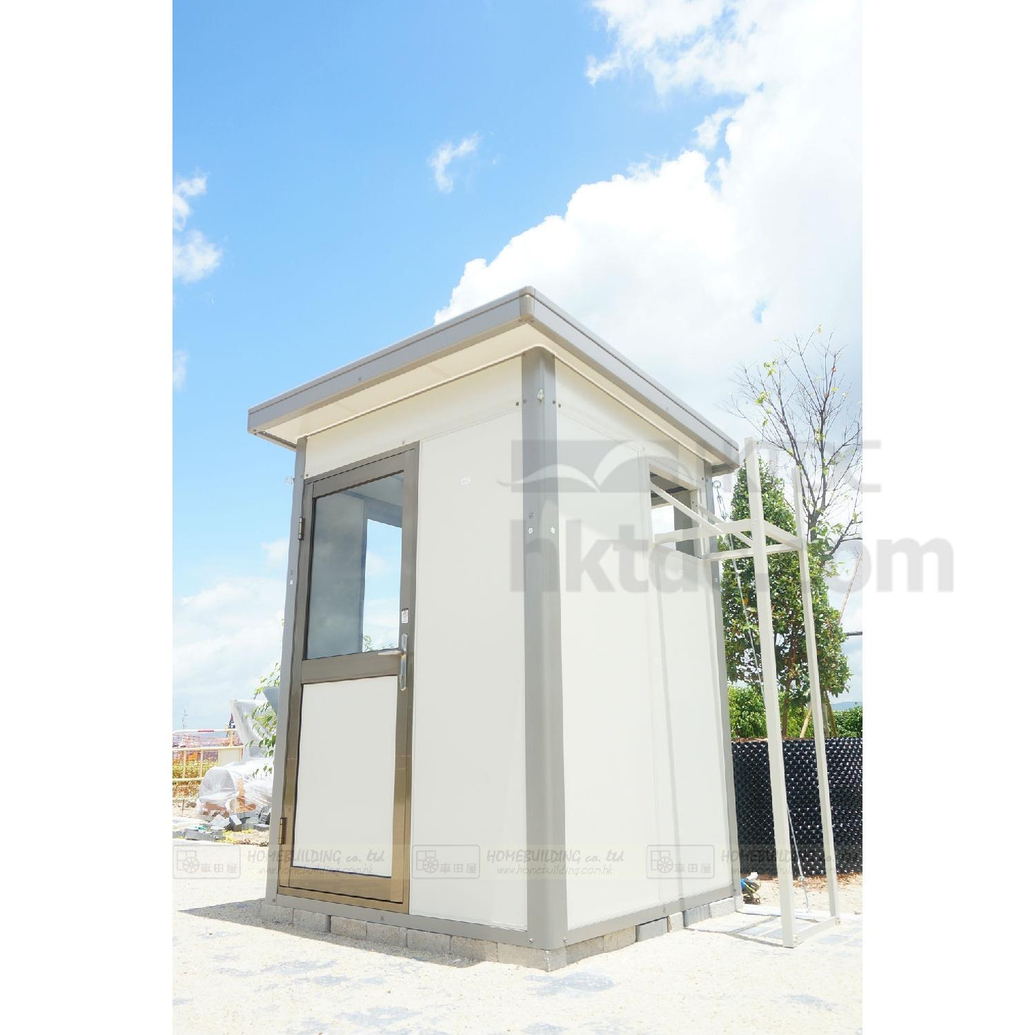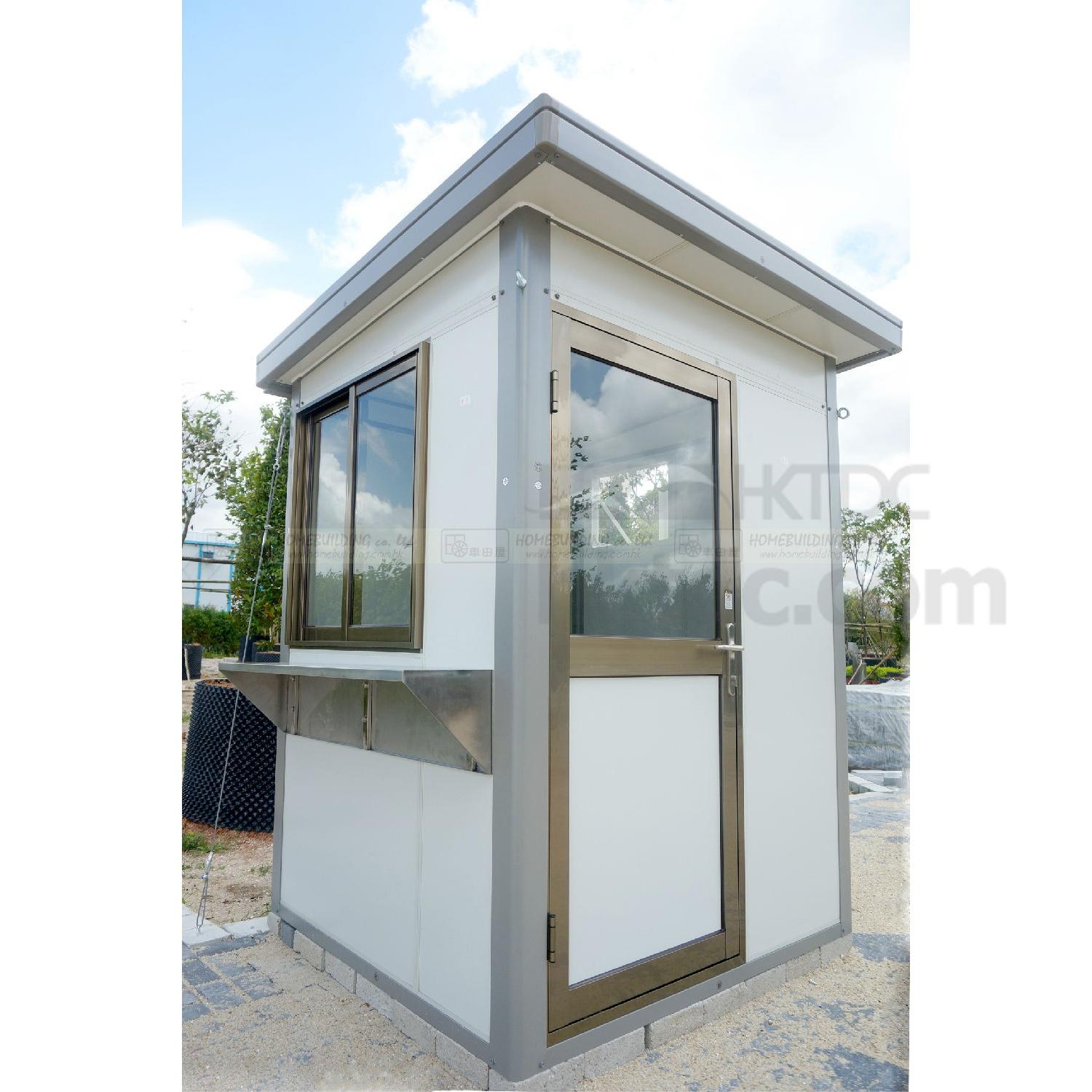 Featured here is a prefabricated aluminum guard kiosk with 1 door and 1 window. It is made with 50mm thick heat insulated sandwich panel and is easy to assemble. This guard kiosk has wood flooring includes one folding door and one sliding window.