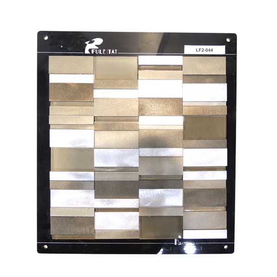 This is a mosaic tile made of high-quality aluminum. It is designed with rectangular elements in assorted colors. This charming tile is ideal for indoor wall decorations.