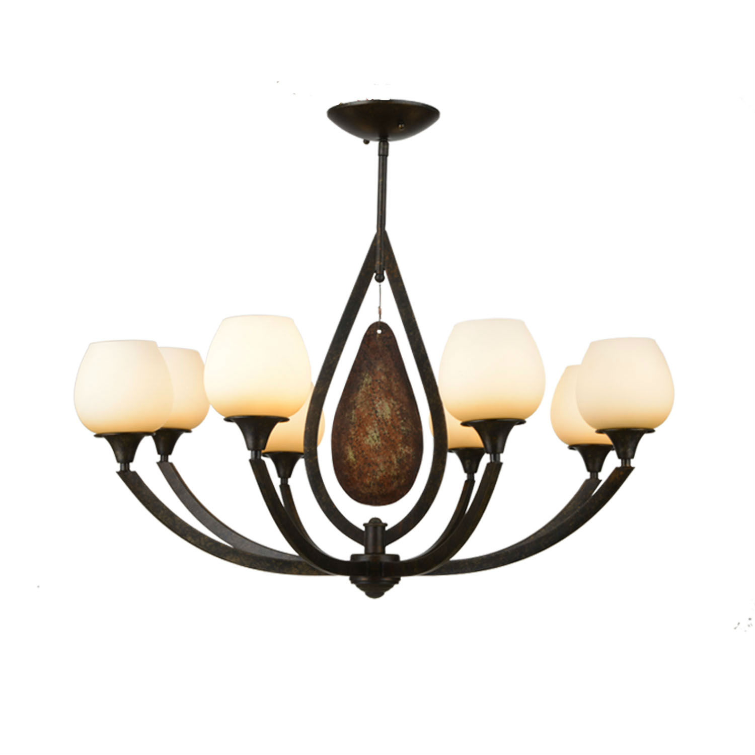 Rural and classic in style, the presented chandelier will provide gentle illumination to your home. Rich rustic-iron finish and antique-ivory glass shades unite to bring a cozy atmosphere into your living space. Firmly constructed in simple lines, this chandelier combines beauty and durability.