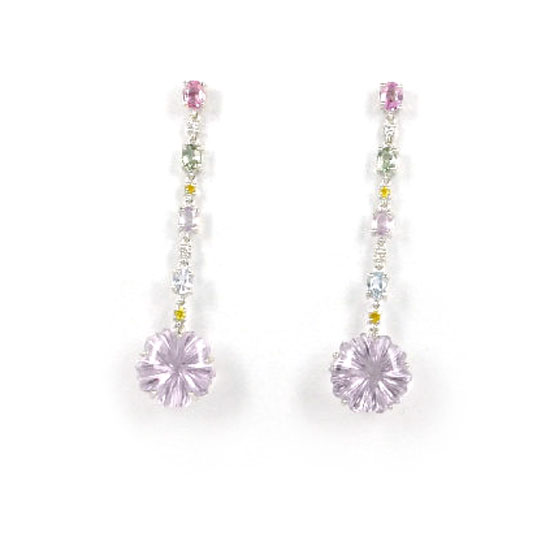 • 18K white gold earrings with diamonds, color sapphires and laser cut amethyst stones.
