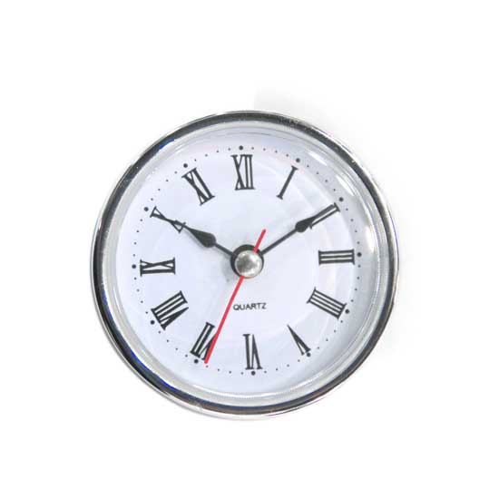 Displayed is an analog clock that features Roman numeral hour markers. Made of high quality materials, this clock has a metal rim and a clear cover for protection. The dial background is designed in white for easy reading.