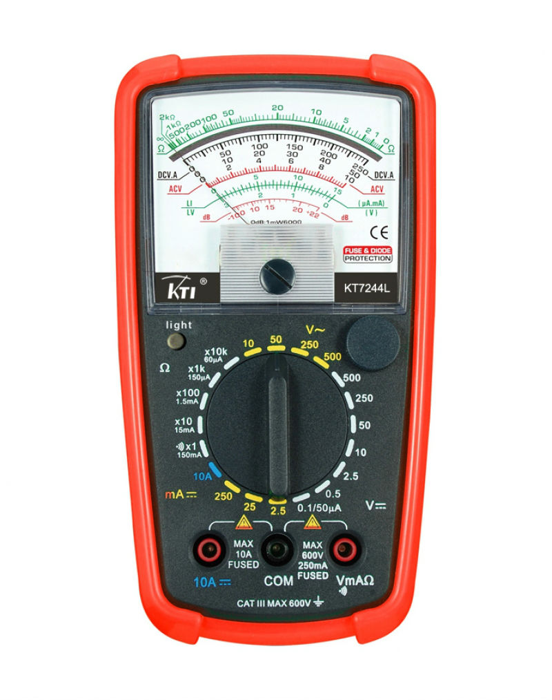 Analogue multimeter in a handy compact housing Mirror scale feature for accurate reading Backlight function 20 ranges in 6 functions Manual range selection Overload protection AC/DC voltage measurement up to 500V DC current measurement up to 10A Resistance measurement up to 20MΩ Audible continuity & diode tests LED test Input impedence: 20KΩ/ VDC,9KΩ/ VAC